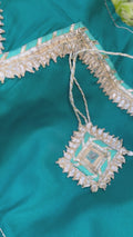 Description: A beautiful composition of a mesmerizing bottle-green zari silk shirt paired with jamawar trouser for under 2s and a green jamawar flapper for over 2-year-old sizes. Accompanying the charming outfit is a golden net dupatta and a matching hair accessory for the cutest look.