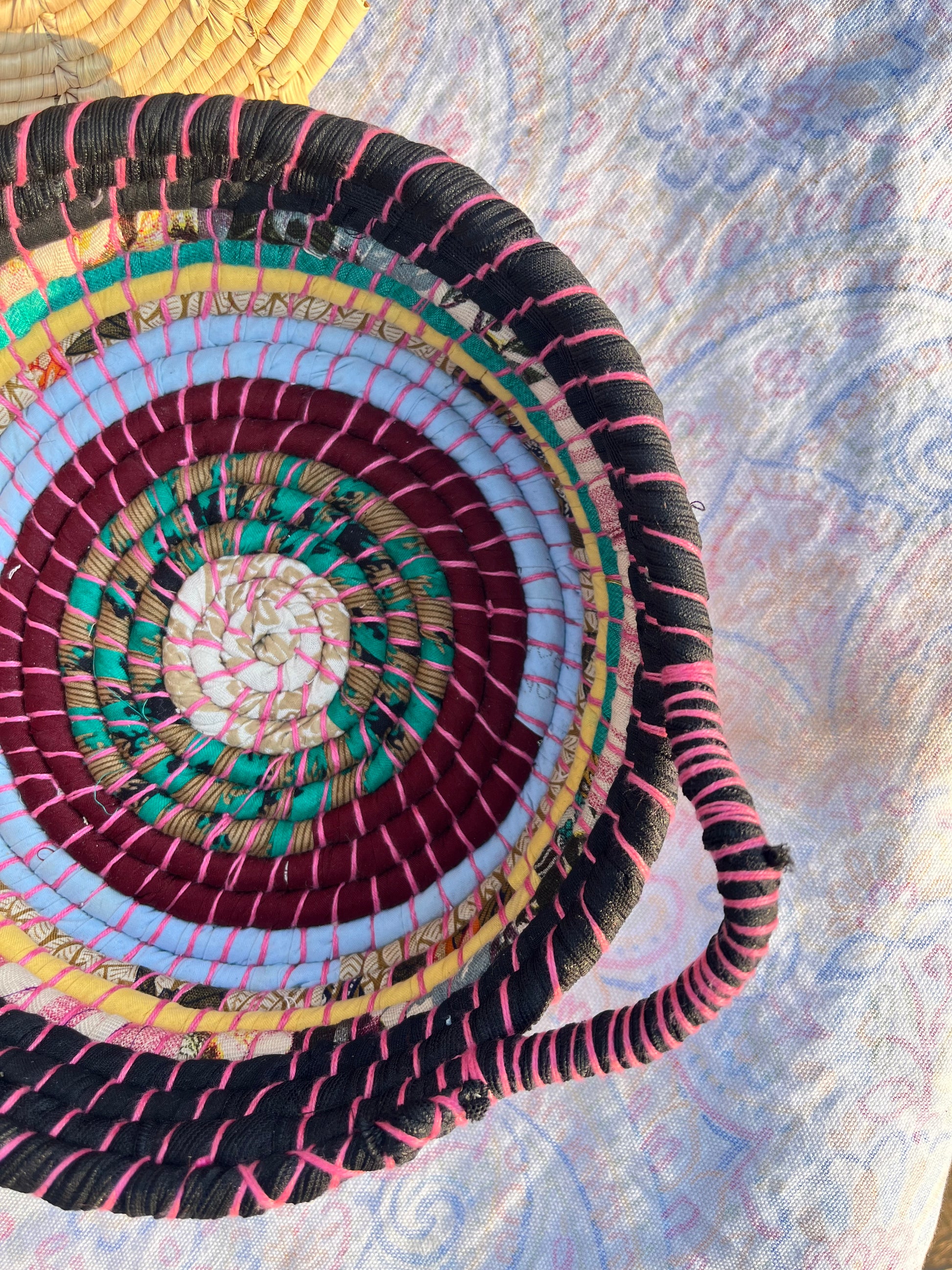 Introducing our lovely black and blue multicolored basket handmade with scraps. Elegantly designed multiple colors of scraps this basket is perfect for any gift!