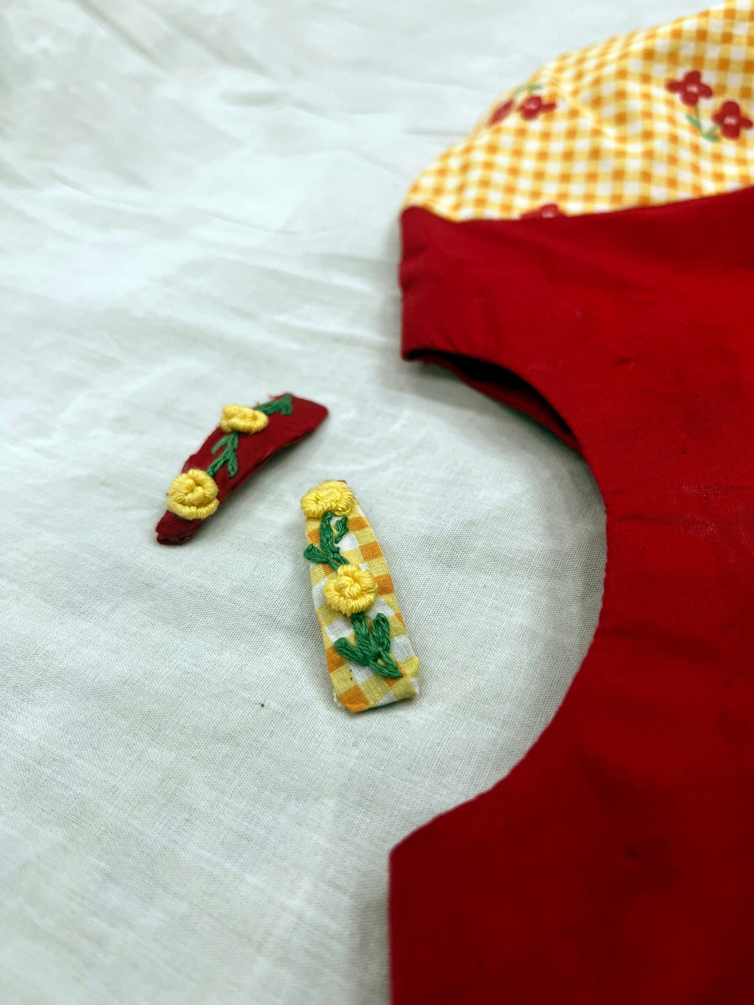 Description: A unique composition of red and beige in this beautiful apparel. With hand embroidery on the bodice of the top and lace accentuated with white pearls and a check-print skirt with lovely red flowers to match the top printed all over. Paired with red aladin style trouser with knotted bows and a matching hair accessory, this outfit is perfect for fall fun.