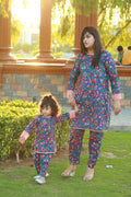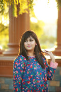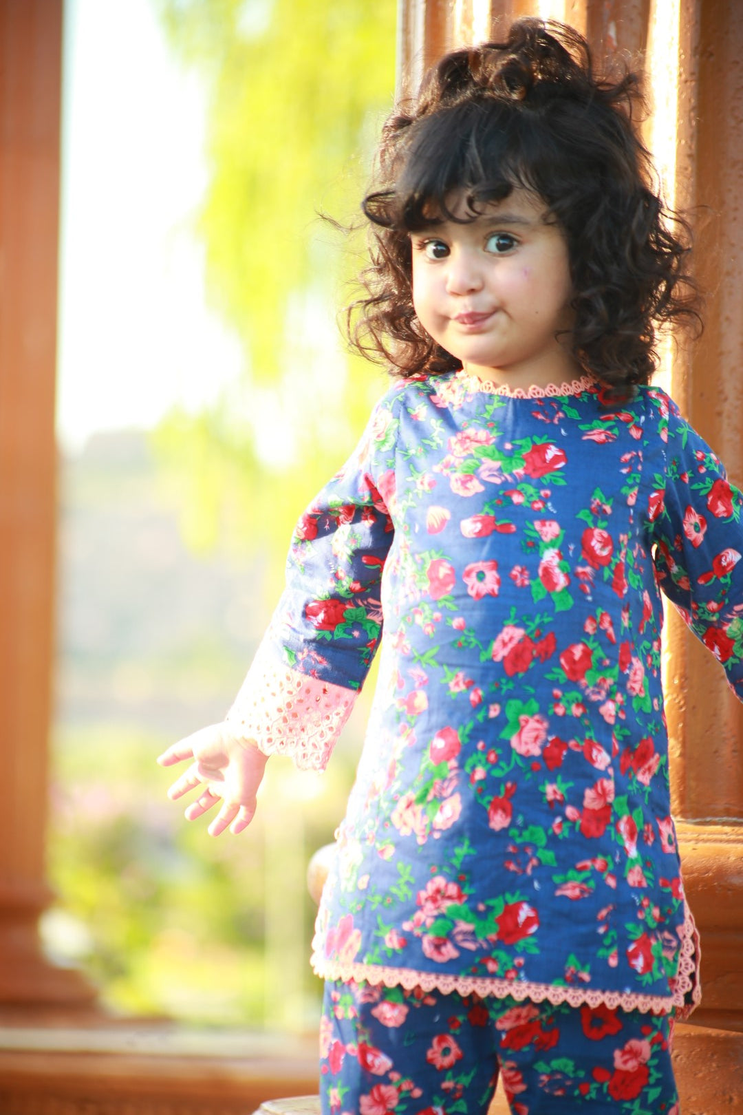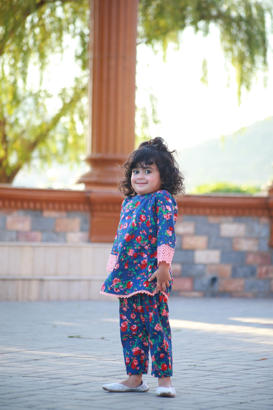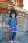 A fascinating composition is layered over this trendy ensemble rendered in a royal blue shade with floral red, peach flower print. It features a graceful kalli shirt beautifully adorned with aesthetically rich floral Co-ord pants. Embellished with chikan kaari lace on sleeves and cotton lace on chaak and daaman. this contemporary shirt is paired with a classy straight trouser a perfect outfit for happening gatherings this season.