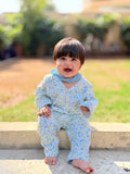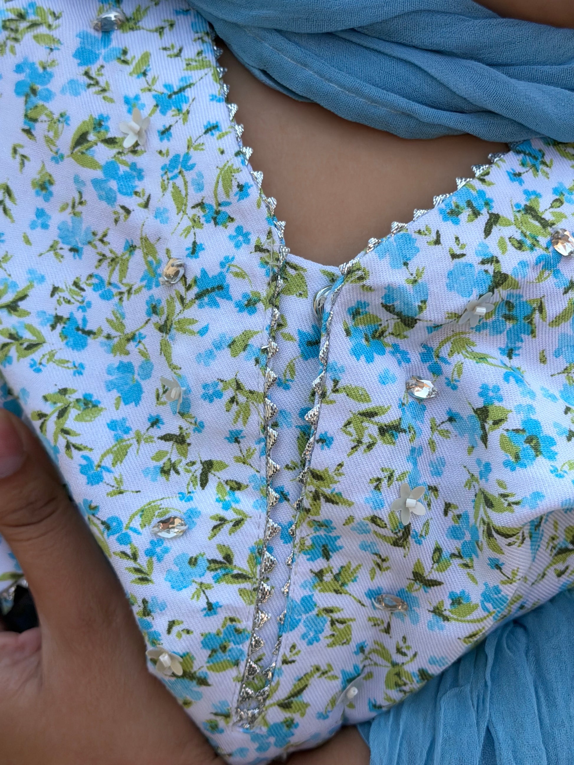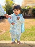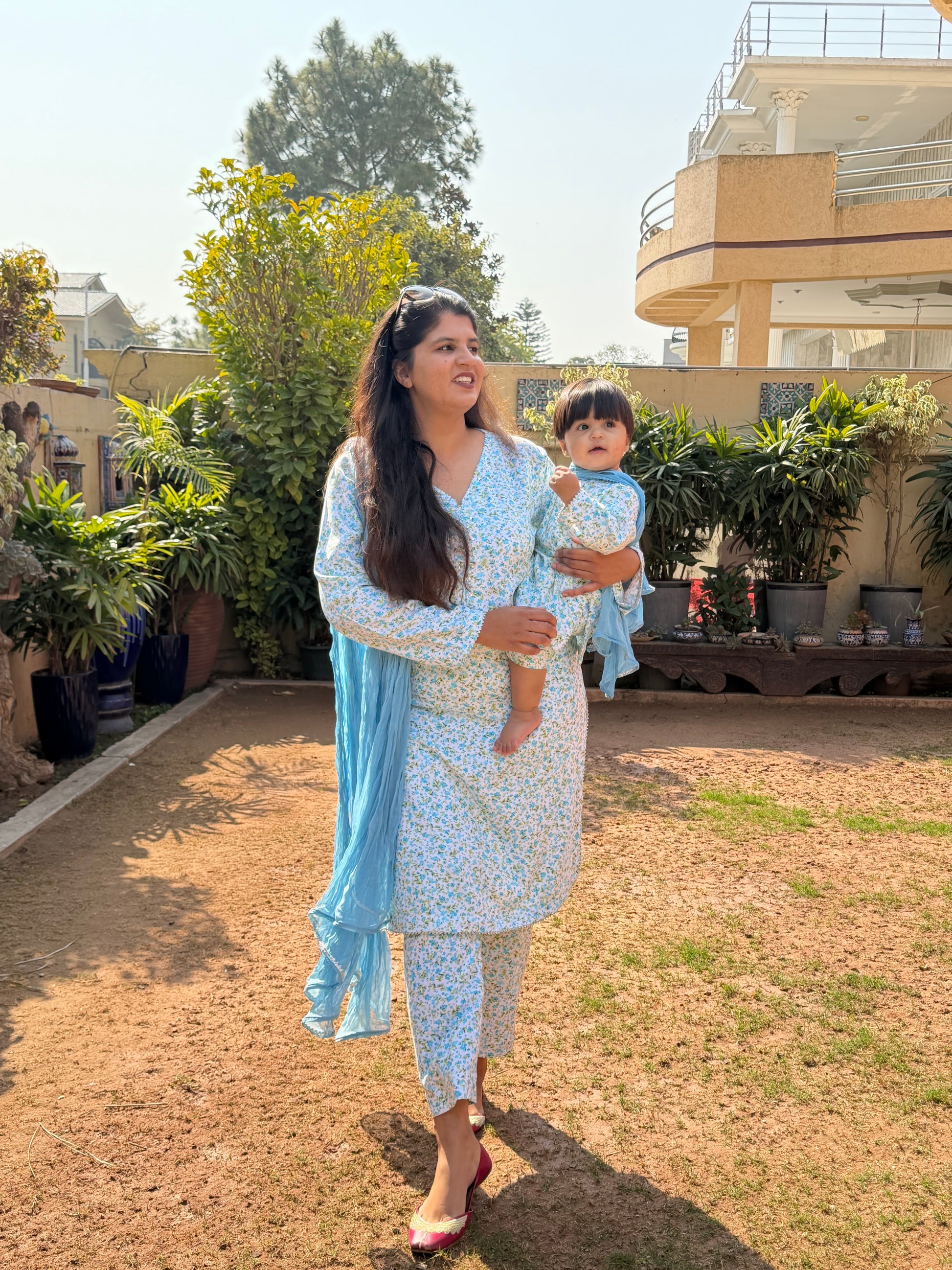 This beautifully coordinated mother-and-baby outfit features a soft floral print in soothing blue tones, designed for comfort and effortless elegance. The ladies’ kurta is paired with a matching trouser and a lightweight chiffon dupatta, creating a graceful and polished look. The baby’s outfit mirrors the same delicate print, making it the perfect twinning ensemble for special gatherings, festive occasions, or memorable photoshoots.