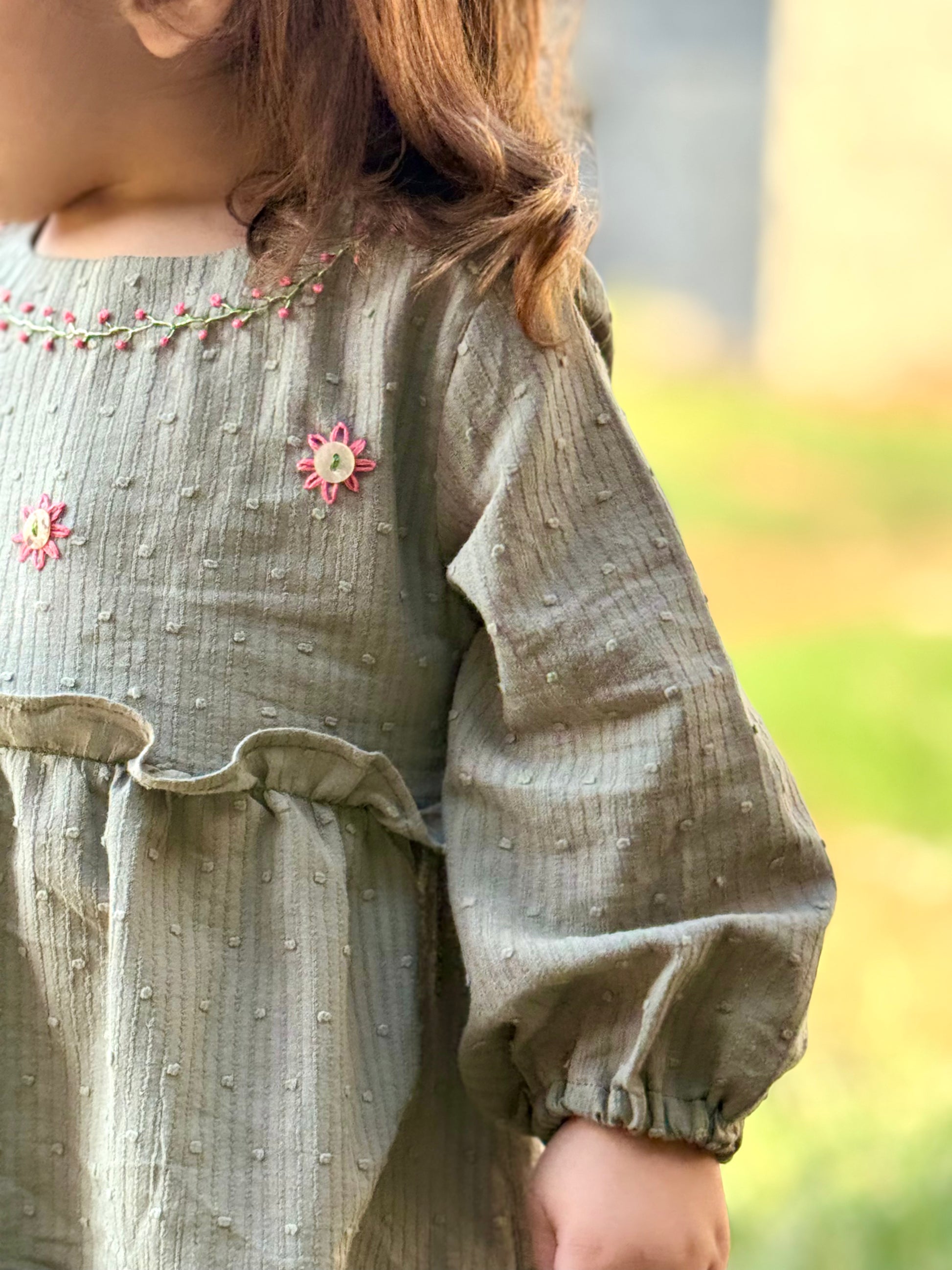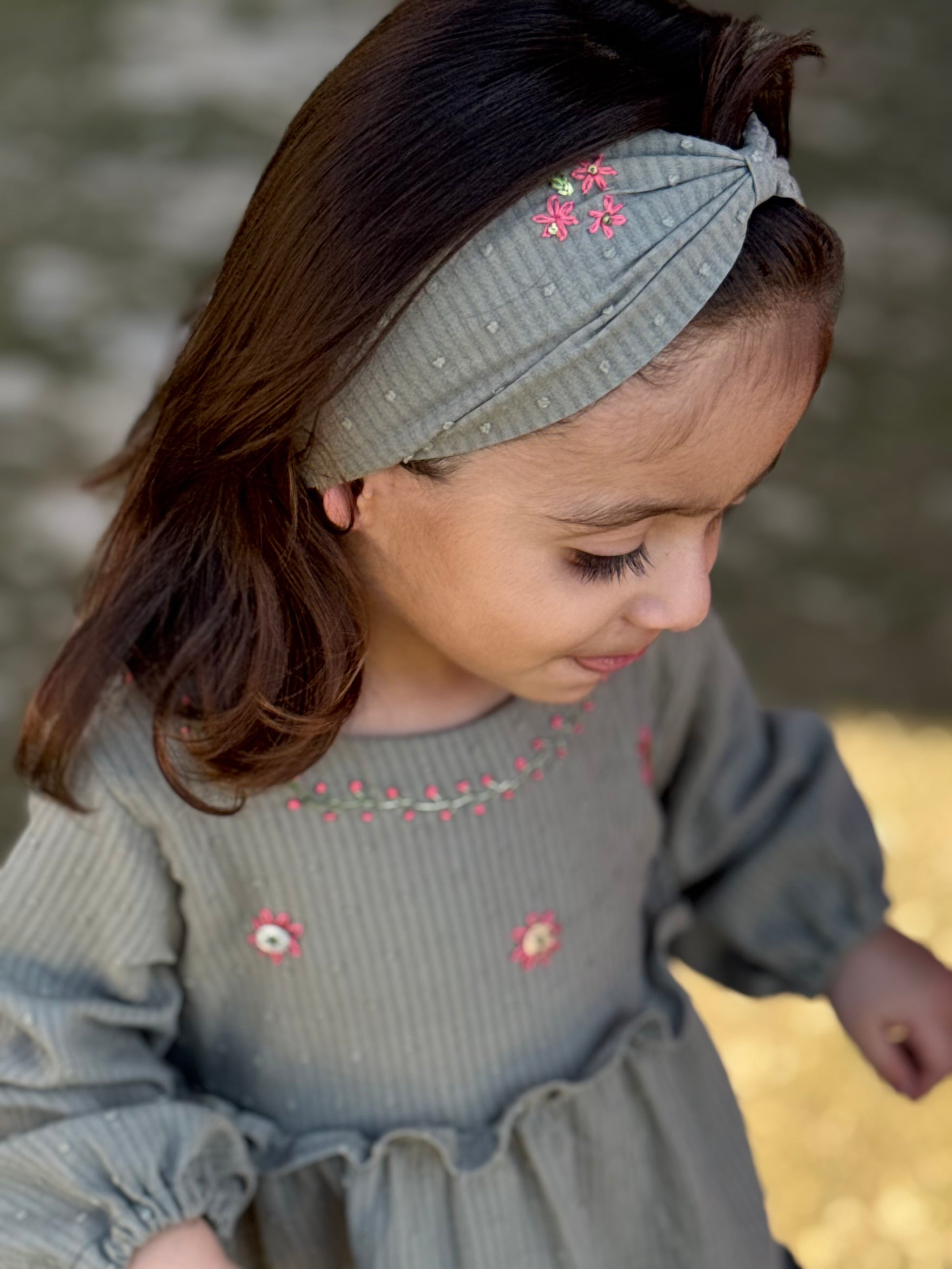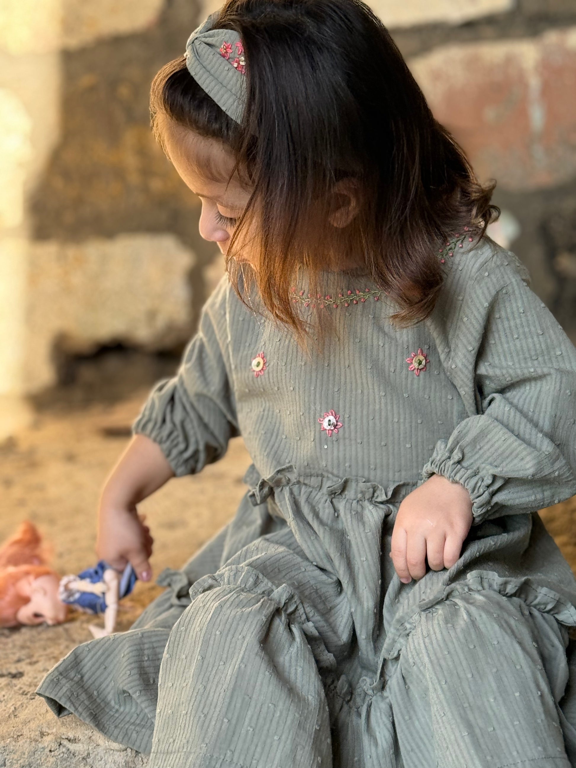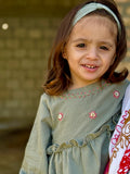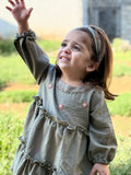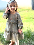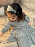 This army green step frock blends playful design with everyday comfort. Made from soft cotton, it features a tiered step silhouette that’s perfect for twirling and easy movement. The earthy green tone makes it a versatile autumn essential, while the included matching headband ties the whole outfit together. Ideal for casual outings, playdates, or festive gatherings.