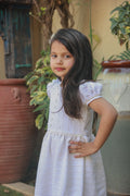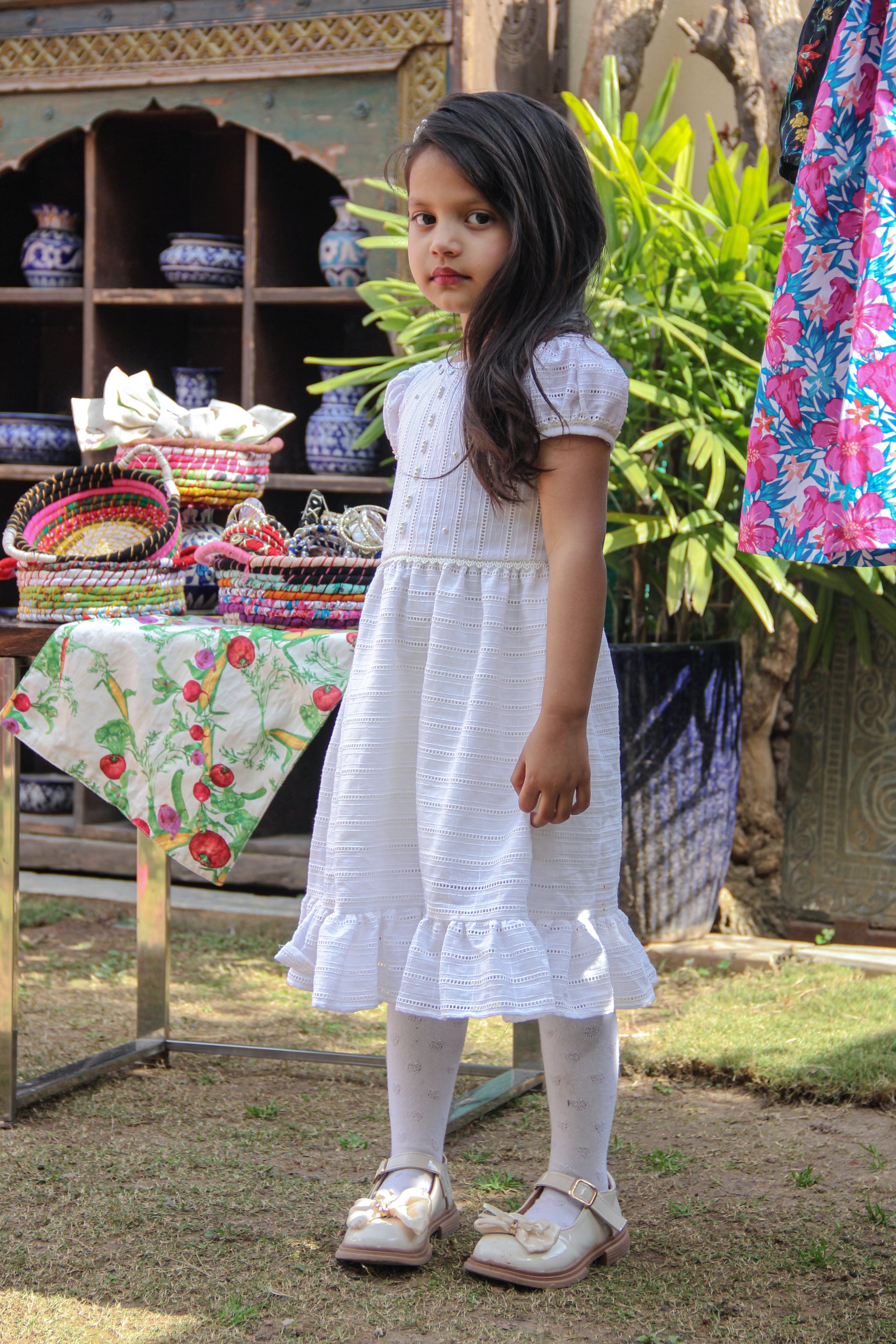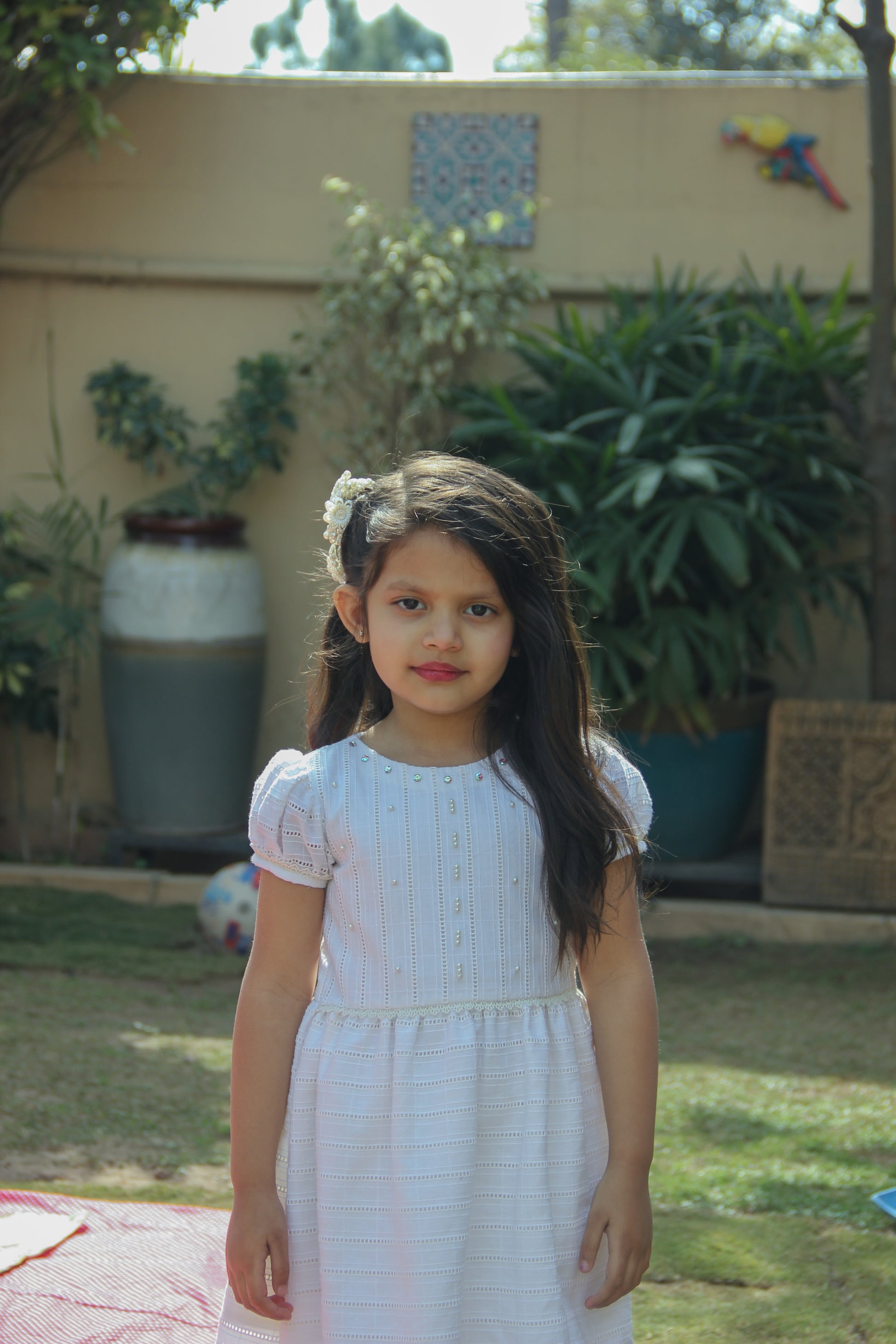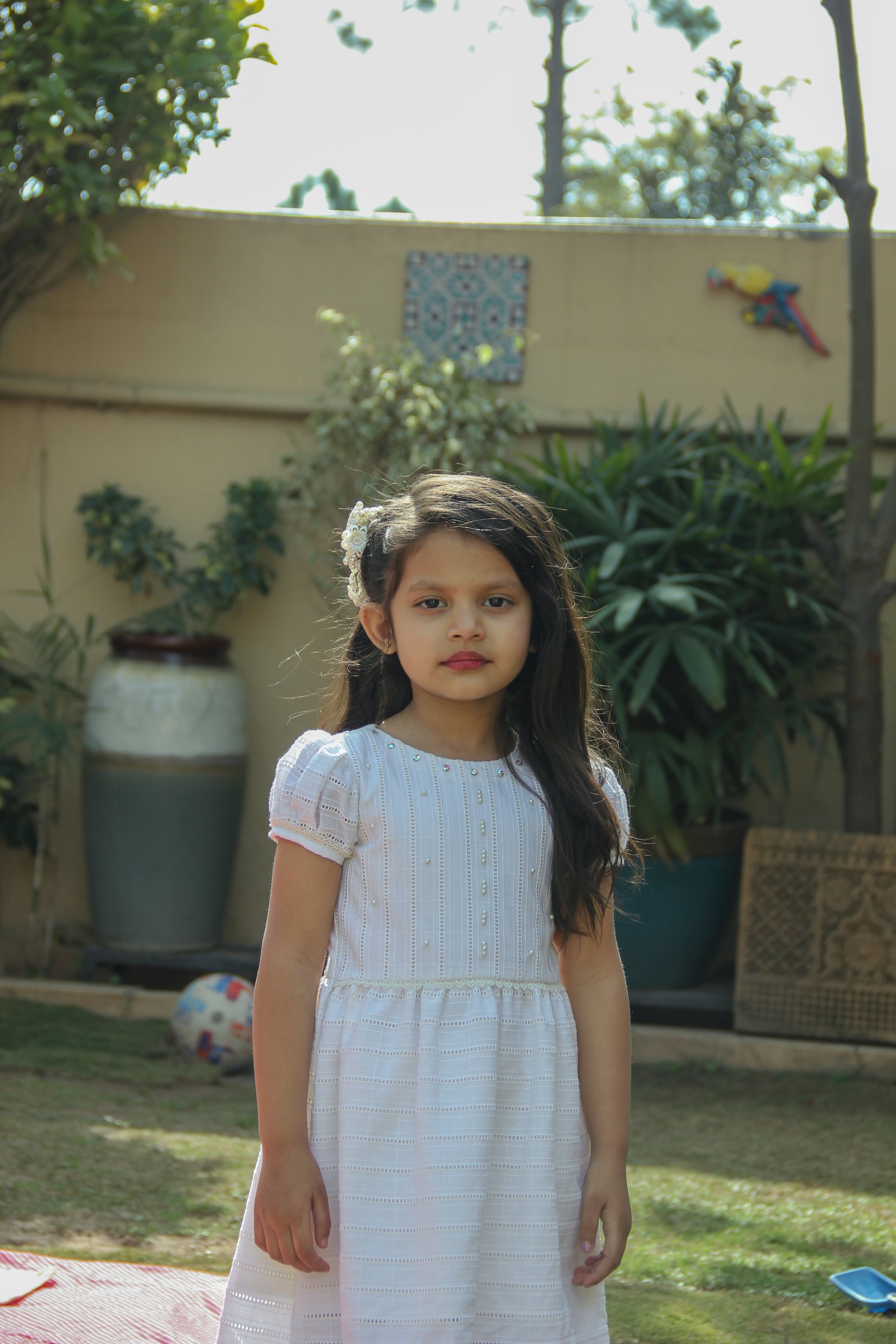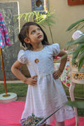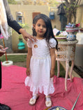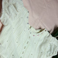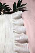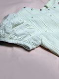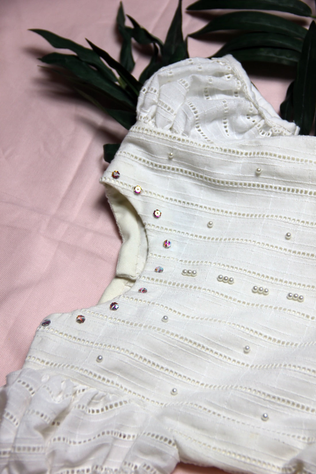 A gracefully elegant composition is layered over this classy ensemble rendered in a subtle pearl white shade. It depicts a contemporary double-layered chicken kari button down top beautifully adorned with lovely beading depicting an overall soft and elegant look.
