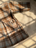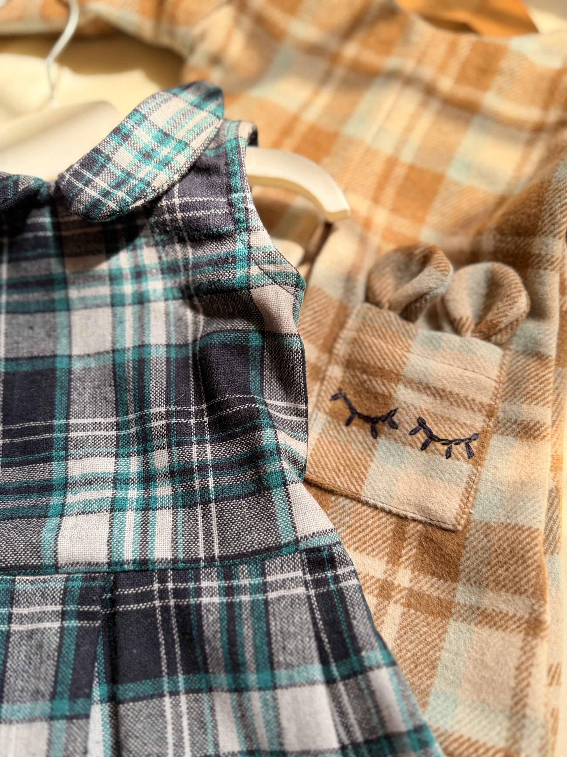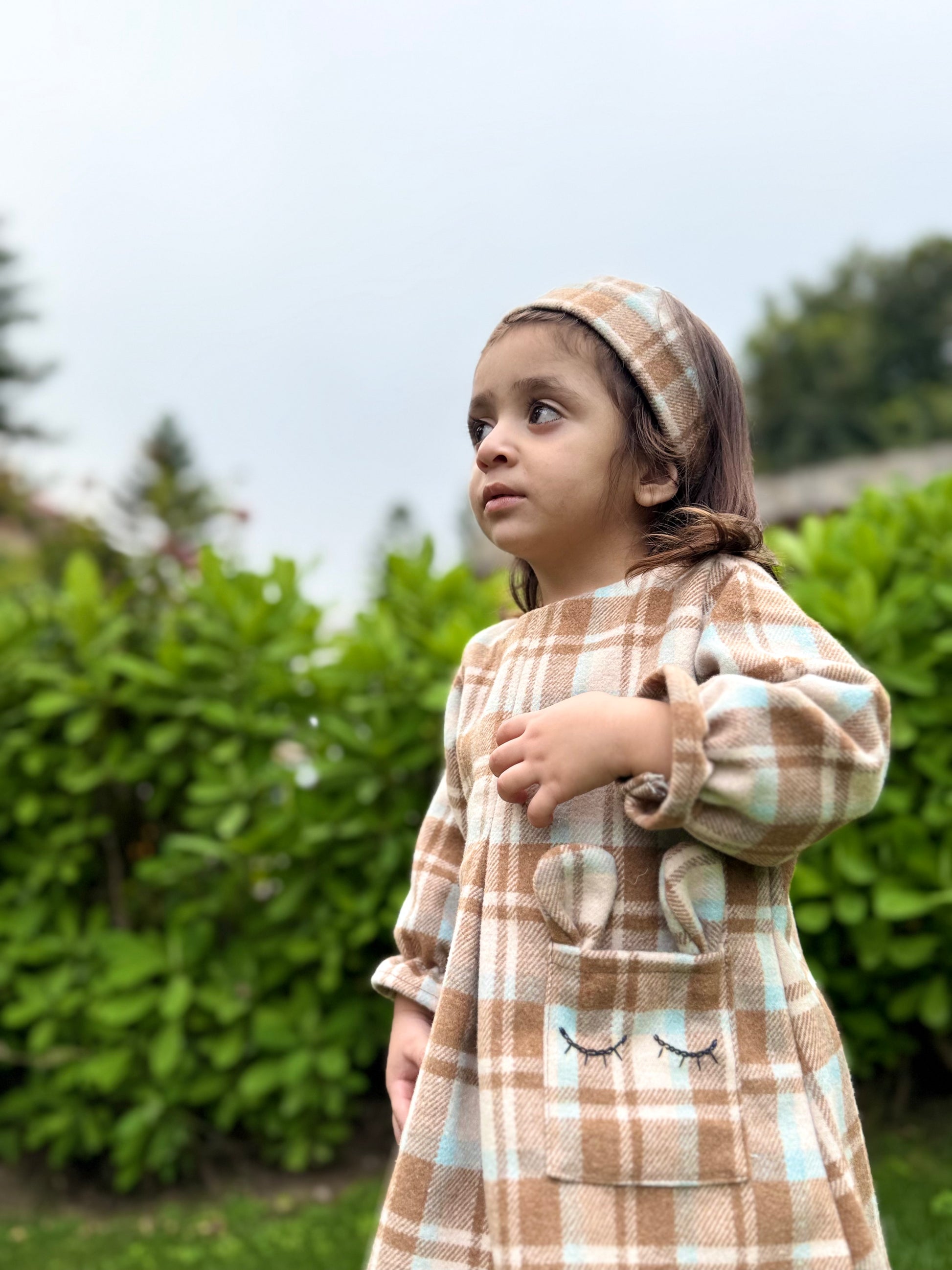 Coat wooken frock perfect for this season ,Beige checked frock with hand embroidered bunny pocket With hair accessory included