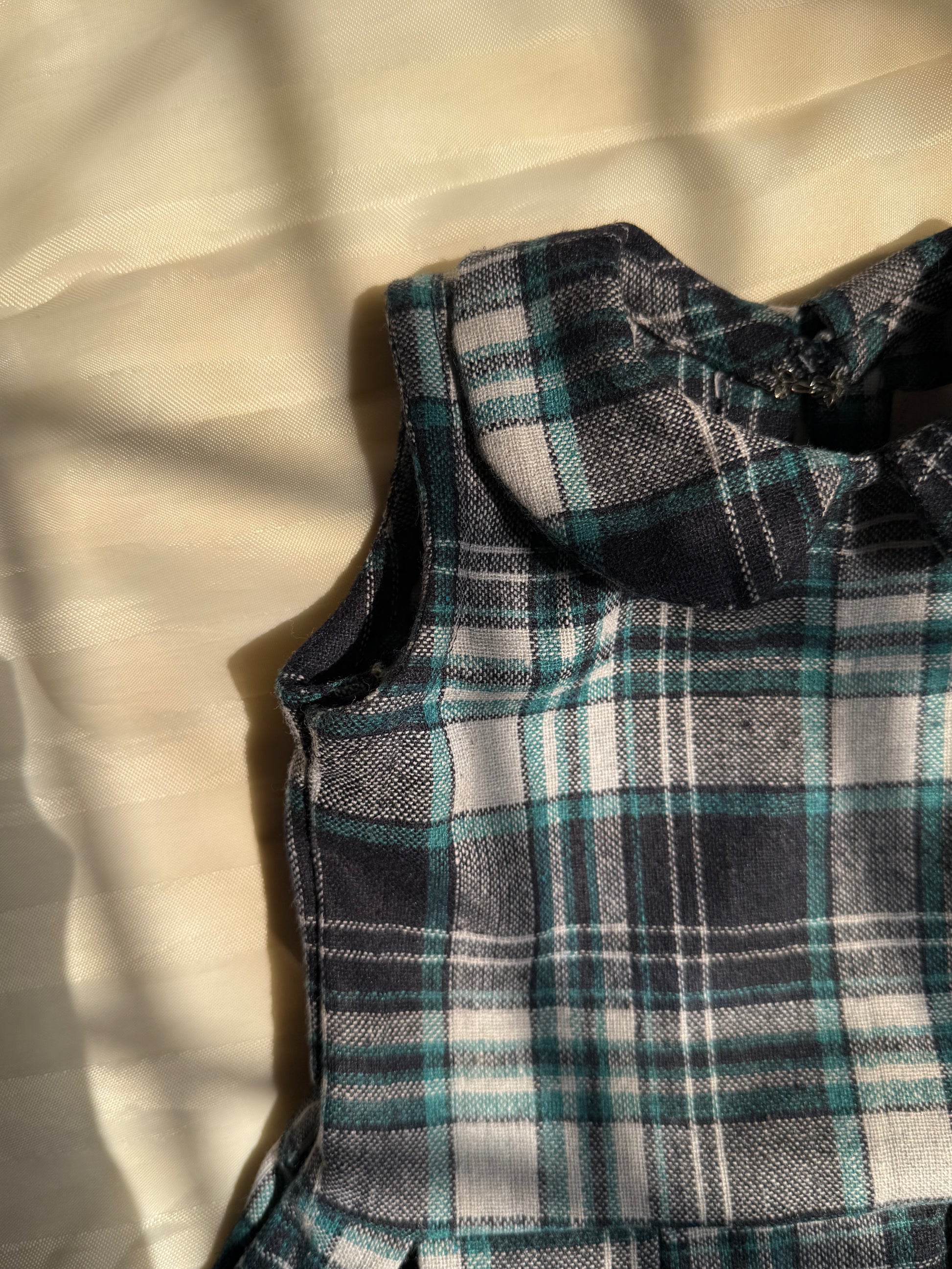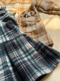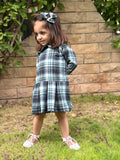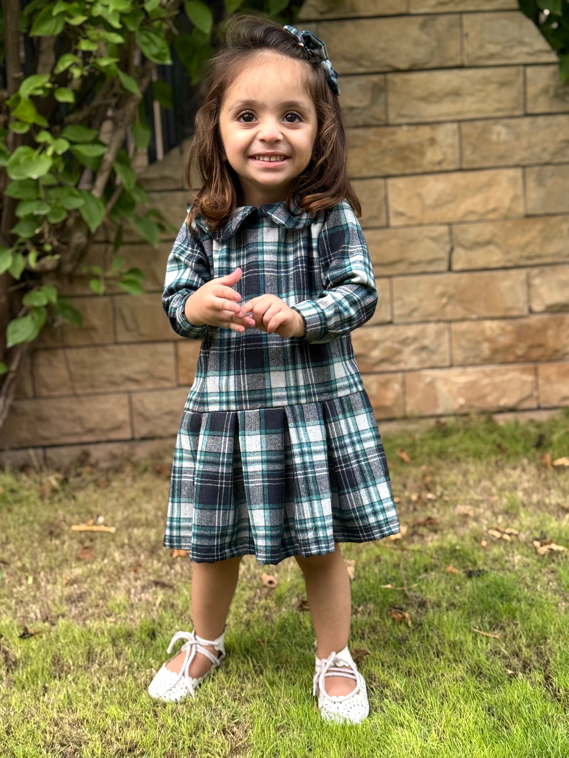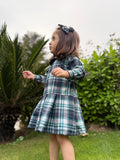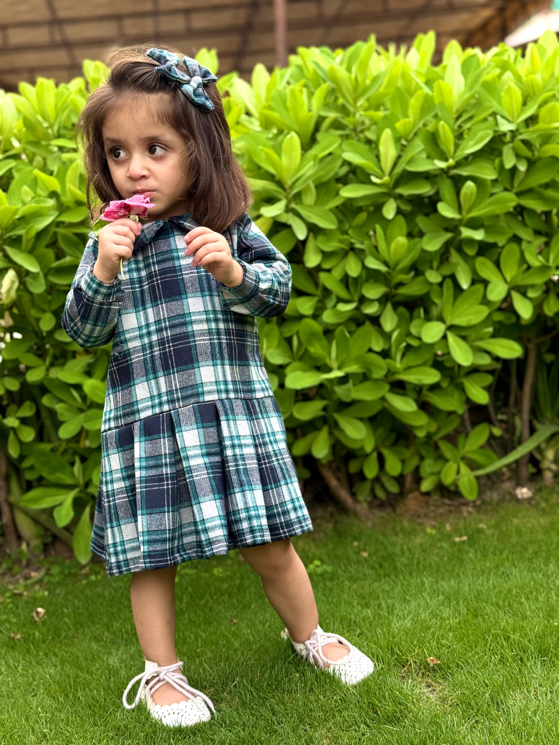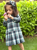 Woolen fabric Blue checked frock box pleated and baby collar. perfect for Winter With hair accessory included