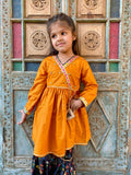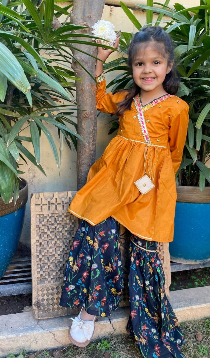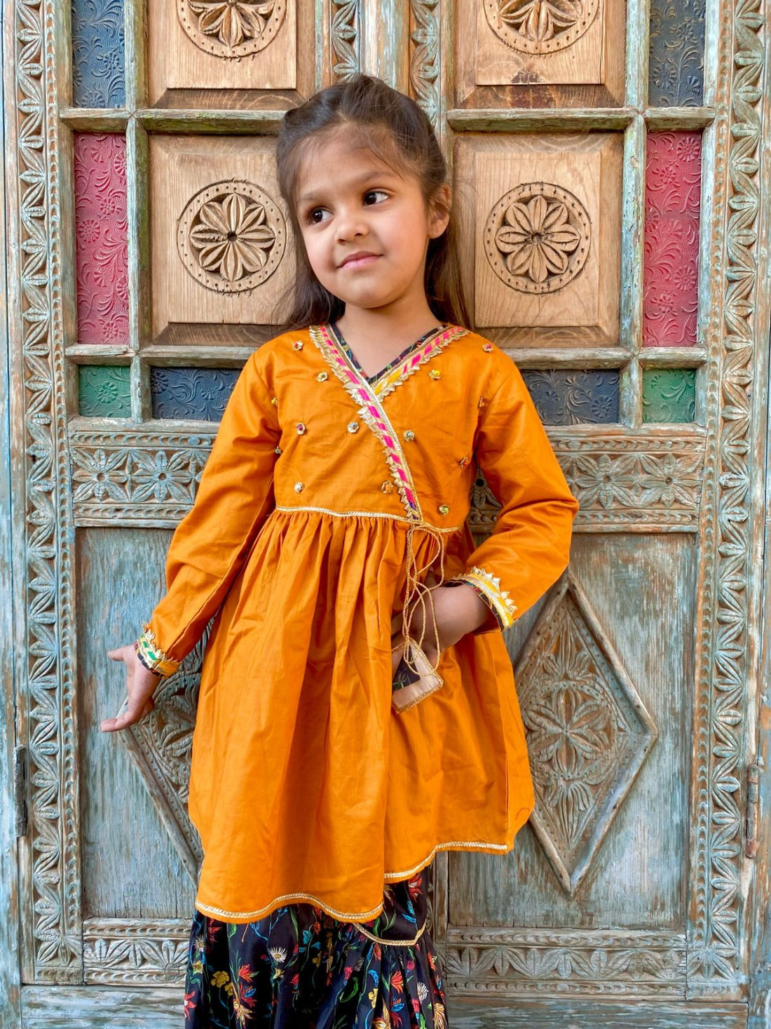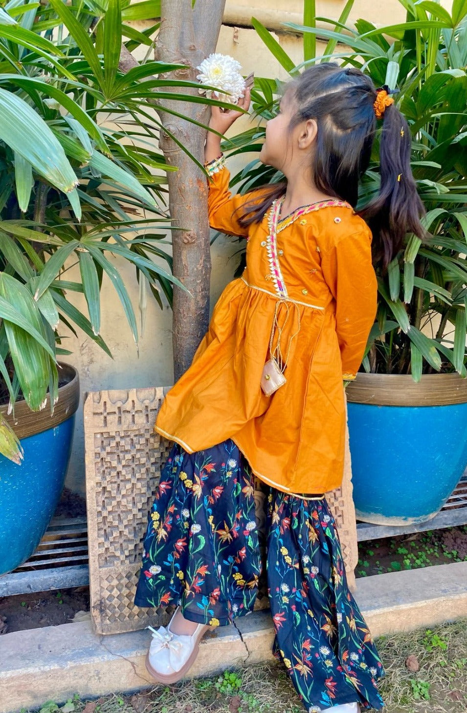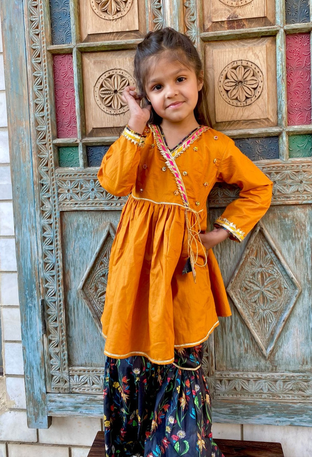 Introducing a classy three-piece kids eastern wear featuring a fascinating mustard angrakha shirt with captivating embroidery in fascinating hues and dazzling details. The elegant shirt is complemented by a contemporary black printed gharara as well as a dupatta and this aesthetic look is a great option for formal gatherings this season.