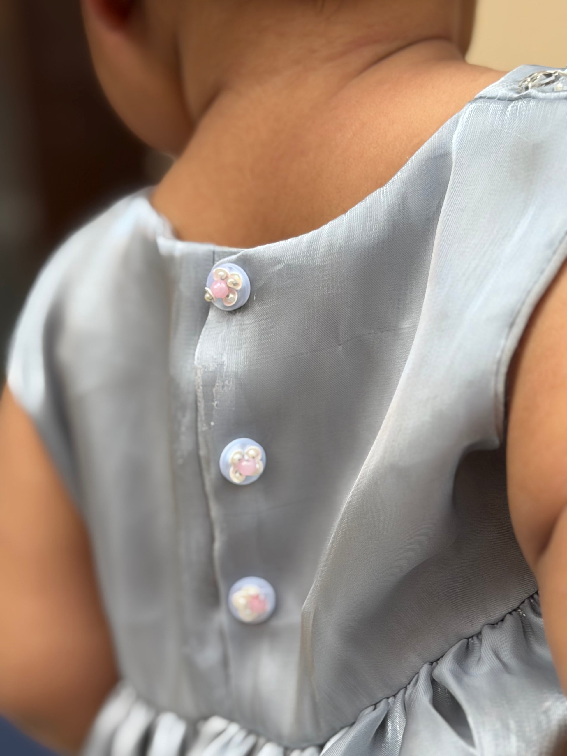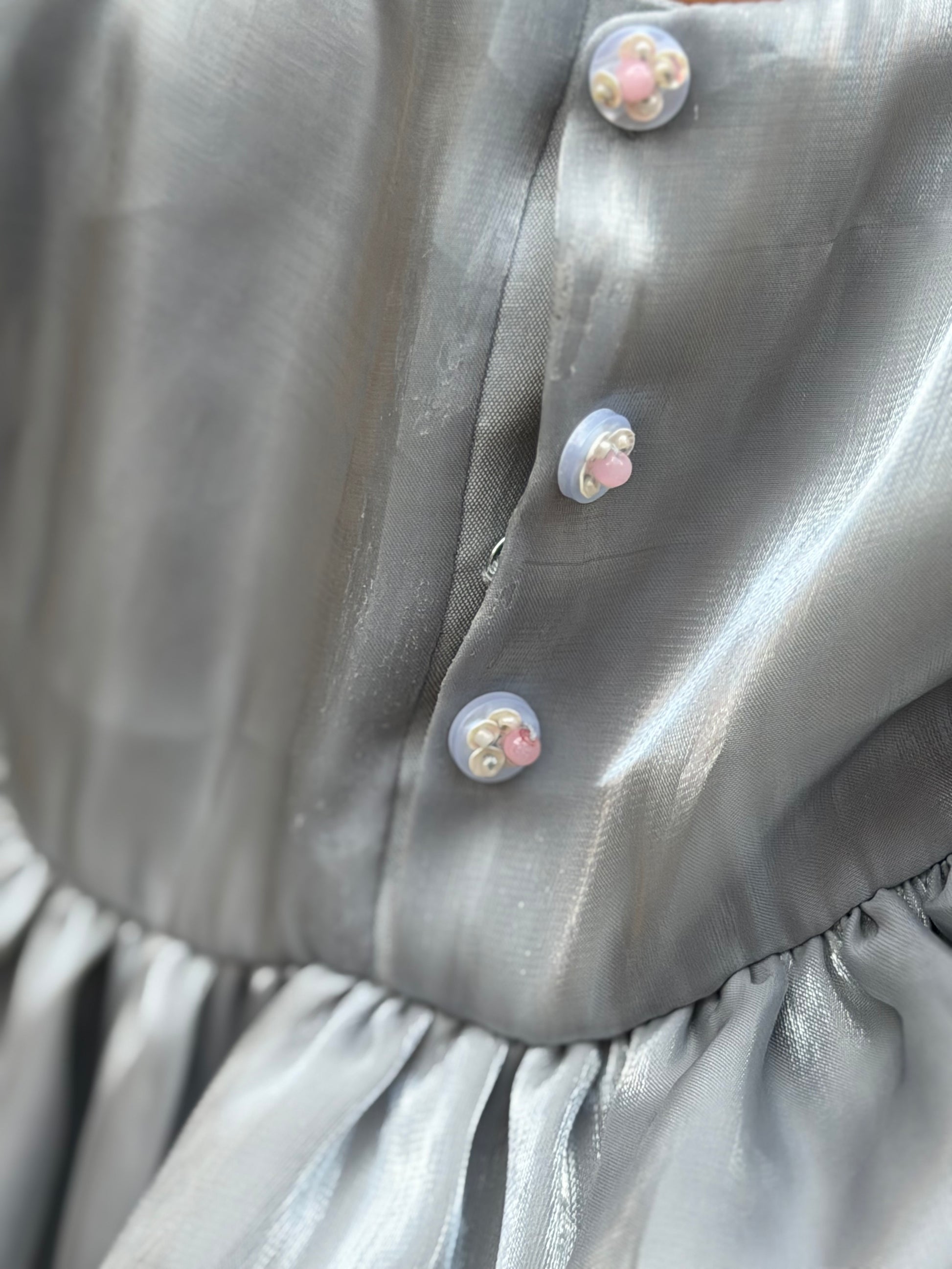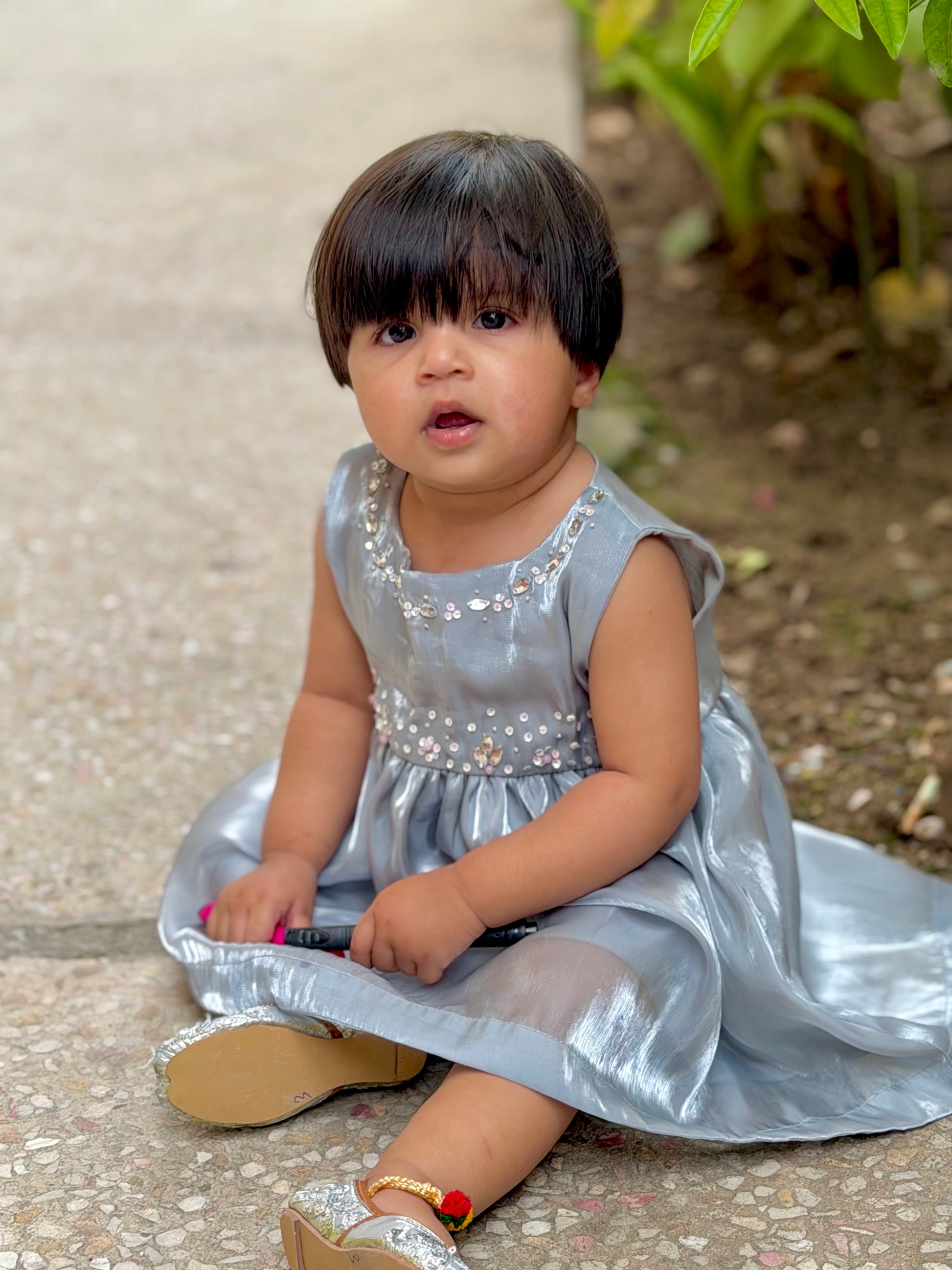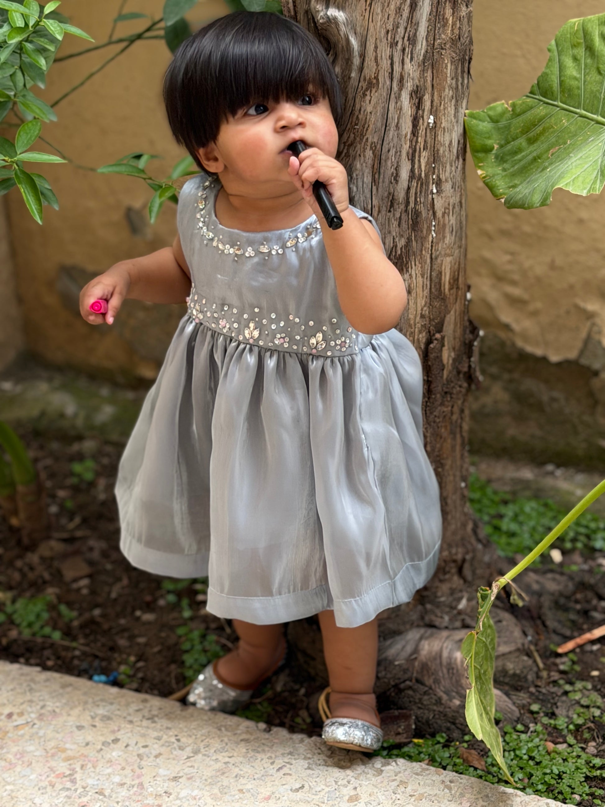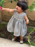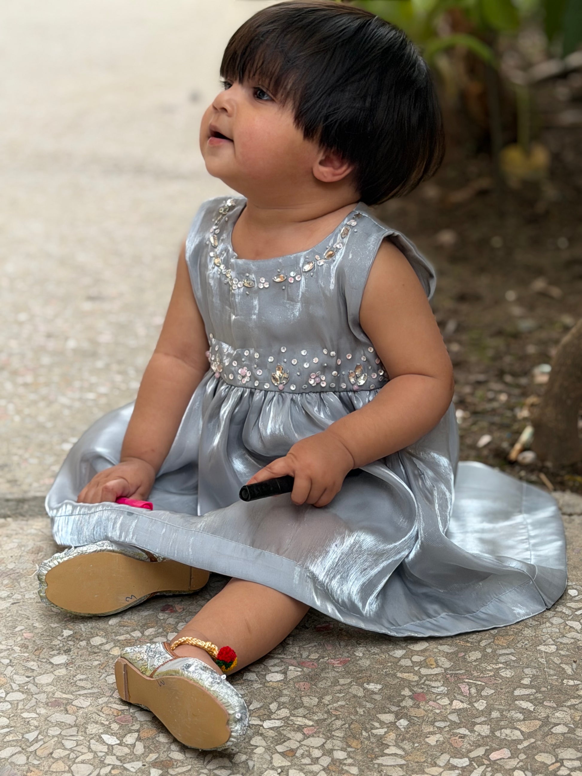 Delicate, elegant, and effortlessly charming — this grey Sheesha silk frock is designed to make every little moment feel special. Crafted from soft, lightweight silk, it offers a gentle sheen that catches the light beautifully, while ensuring all-day comfort for your little one. The subtle embellishments along the neckline add a touch of sparkle, giving it just the right amount of festive flair without overwhelming its simplicity.