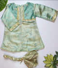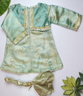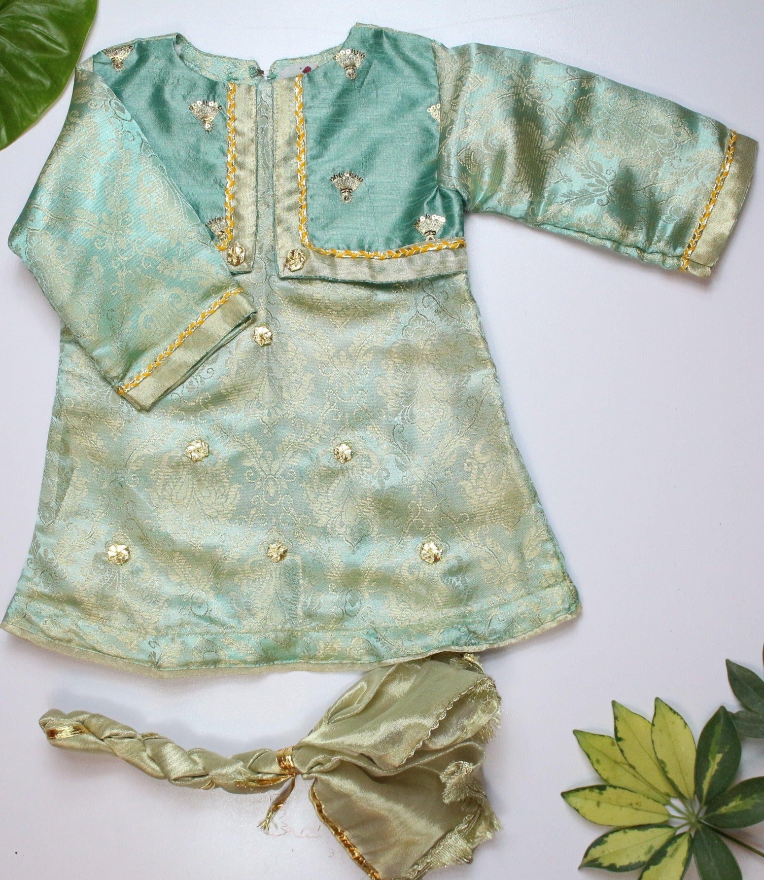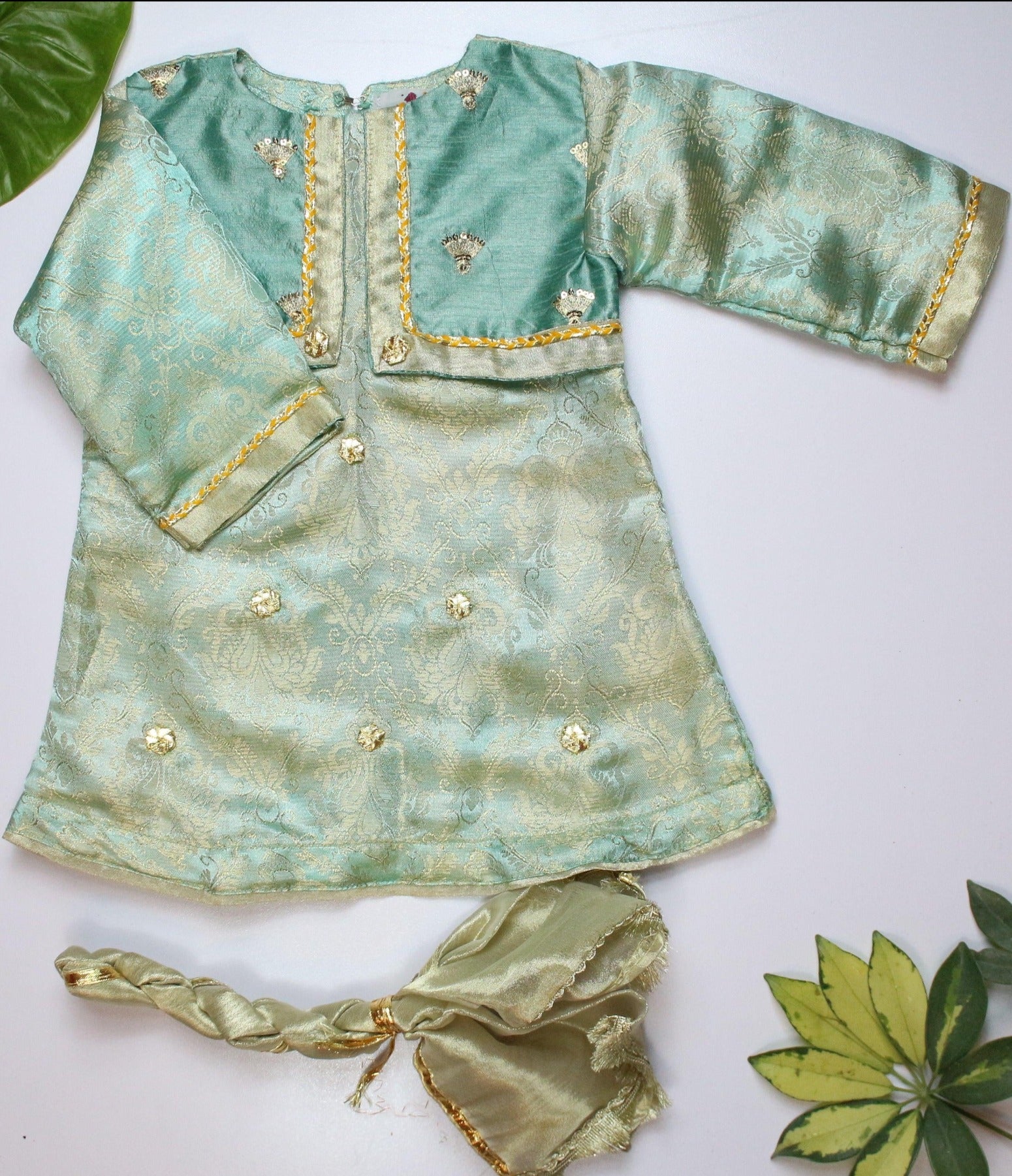 Description: A beautiful composition of a mesmerizing green jamwar koti style shirt decorated with gotta decorations in the front. Accompanying the charming outfit is a matching dupatta for the cutest look. Perfect for any festive event for a lovely and unique look.