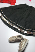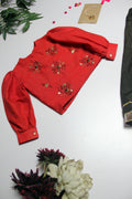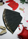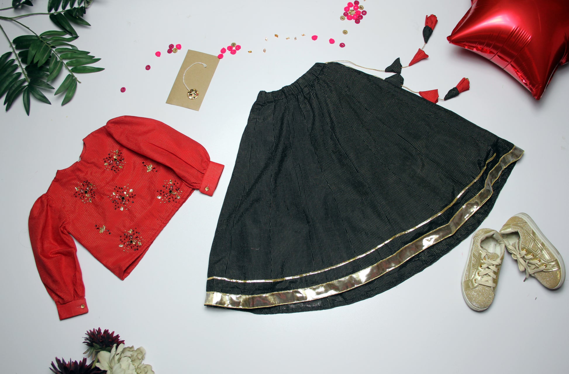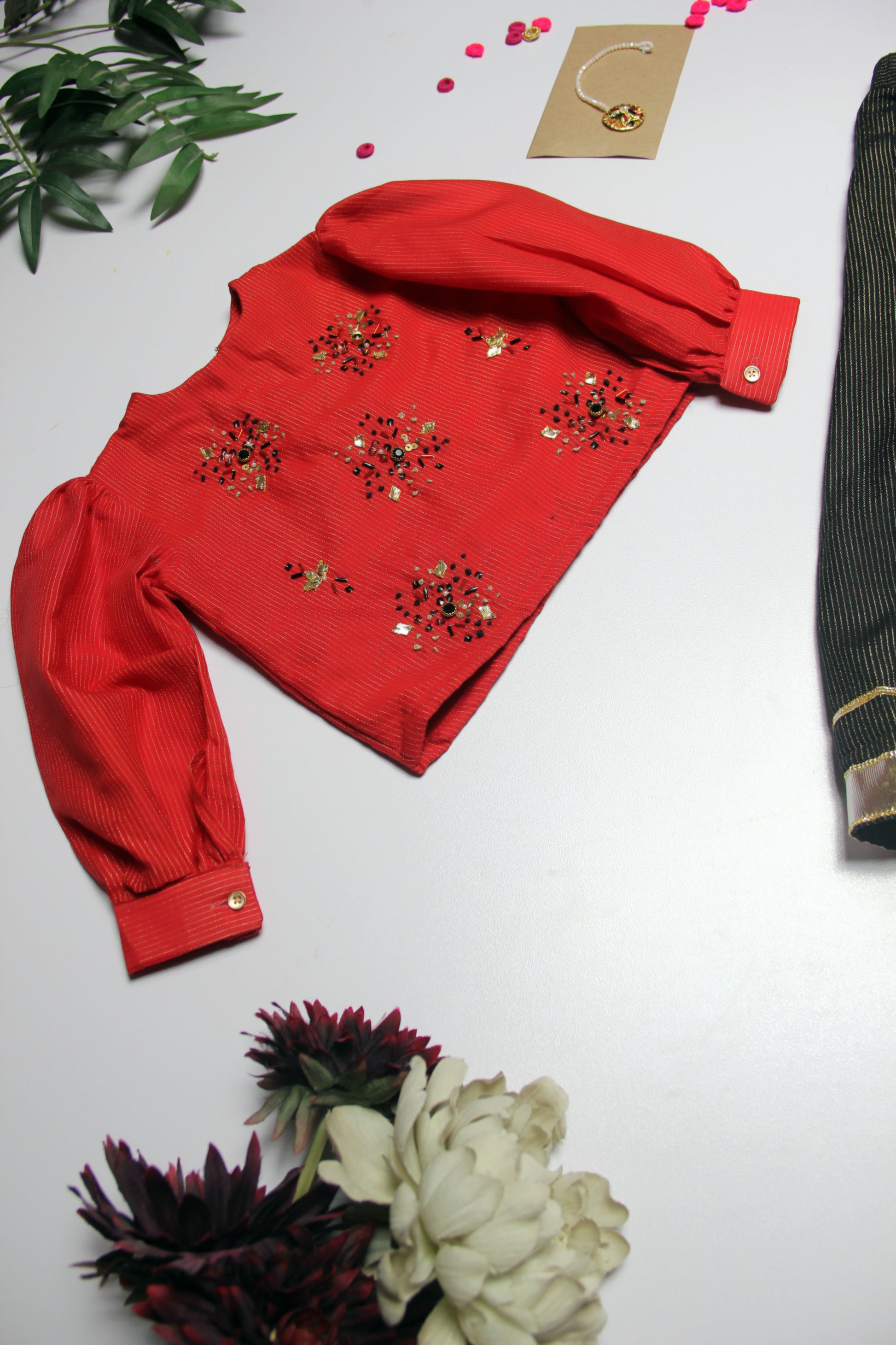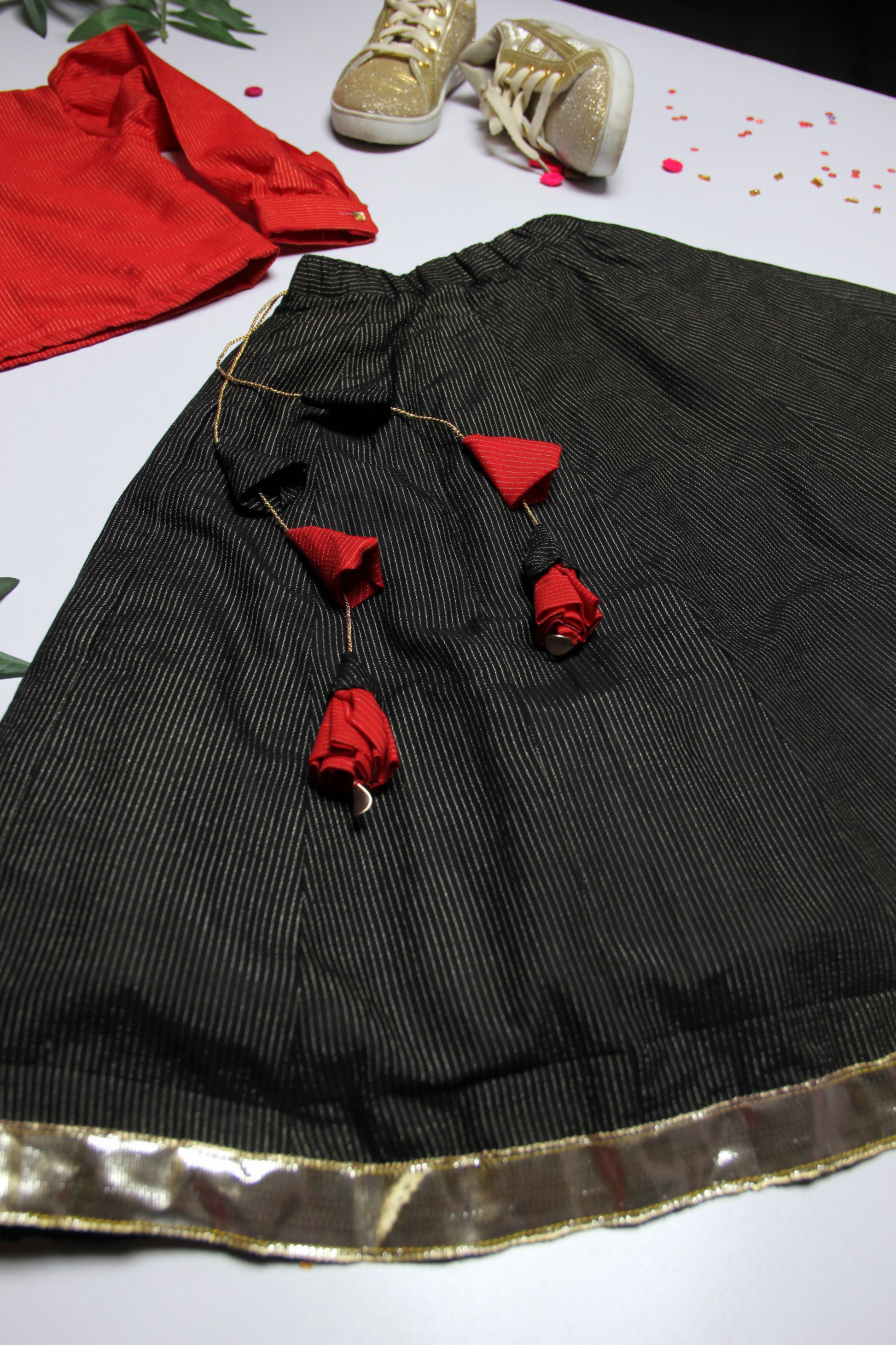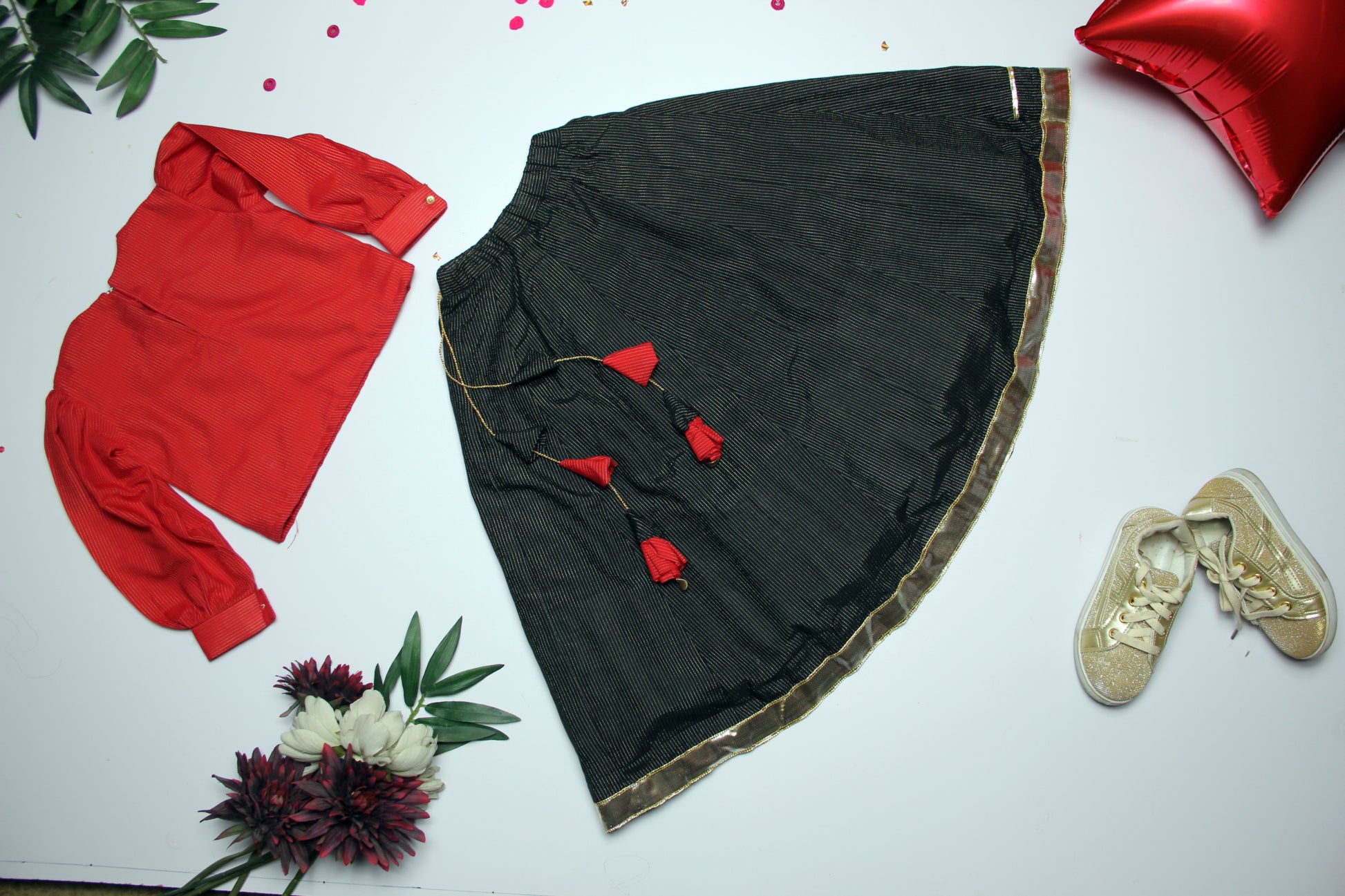 Introducing a classy two-piece kids eastern wear featuring a charming red shirt decorated lovely beads. The elegant shirt is complemented by a lovely zari black cotton lehenga with cancan attached underneath and this aesthetic is a great option for eid and formal gatherings this season. Completing the look is a beautiful delicate tika!