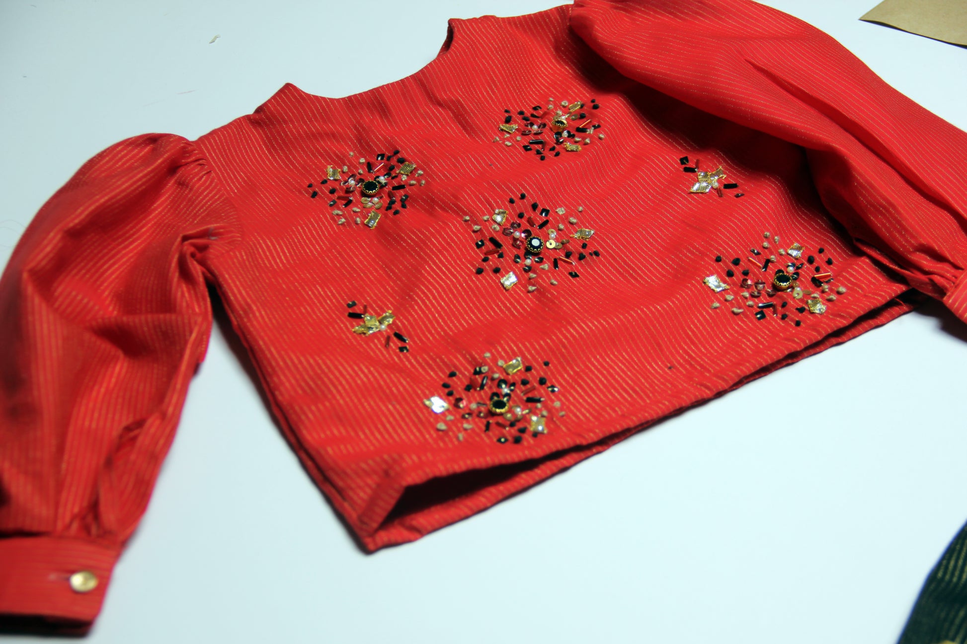 The shirt is double layered choli with cuffed sleeves with golden buttons.