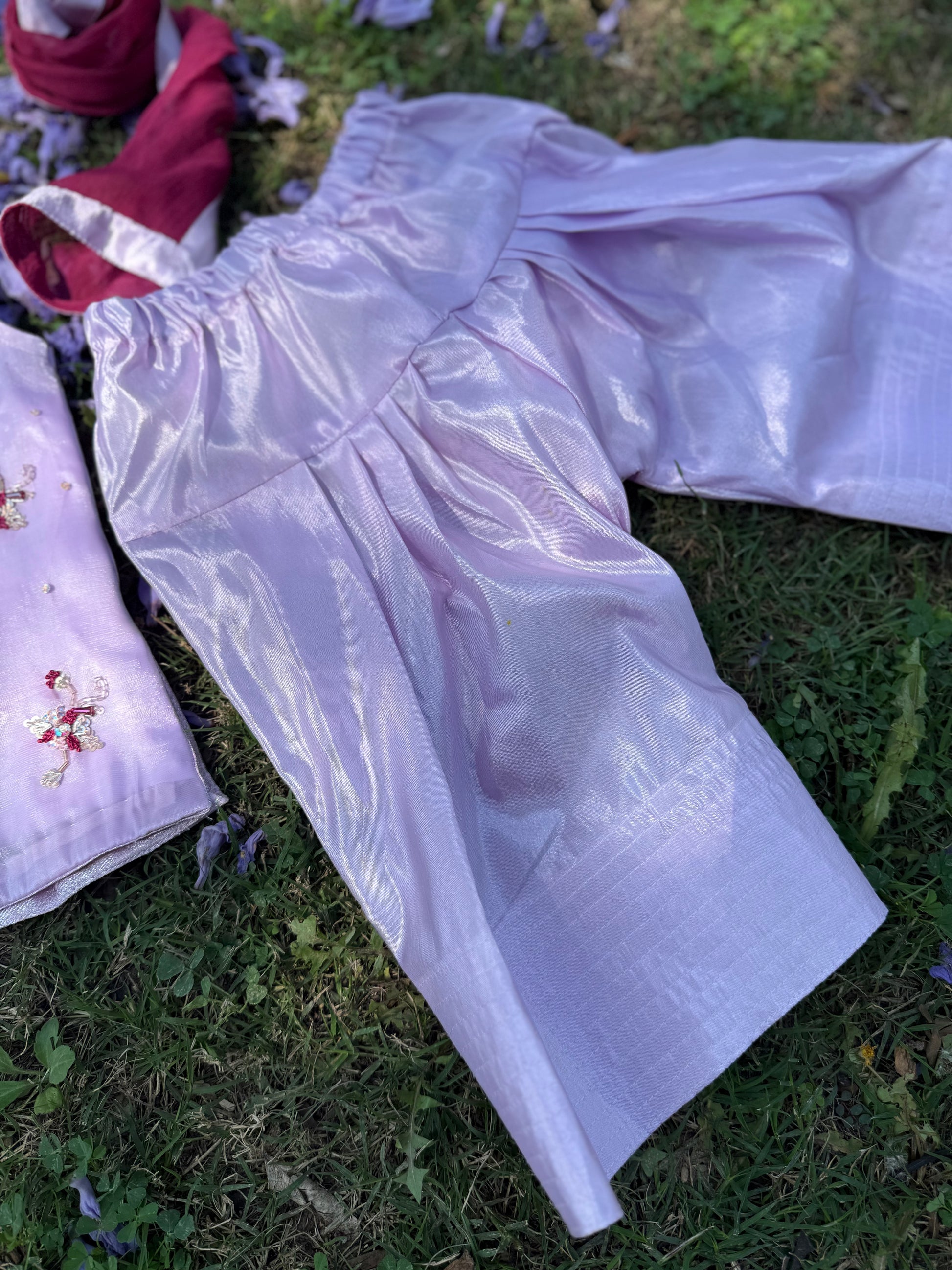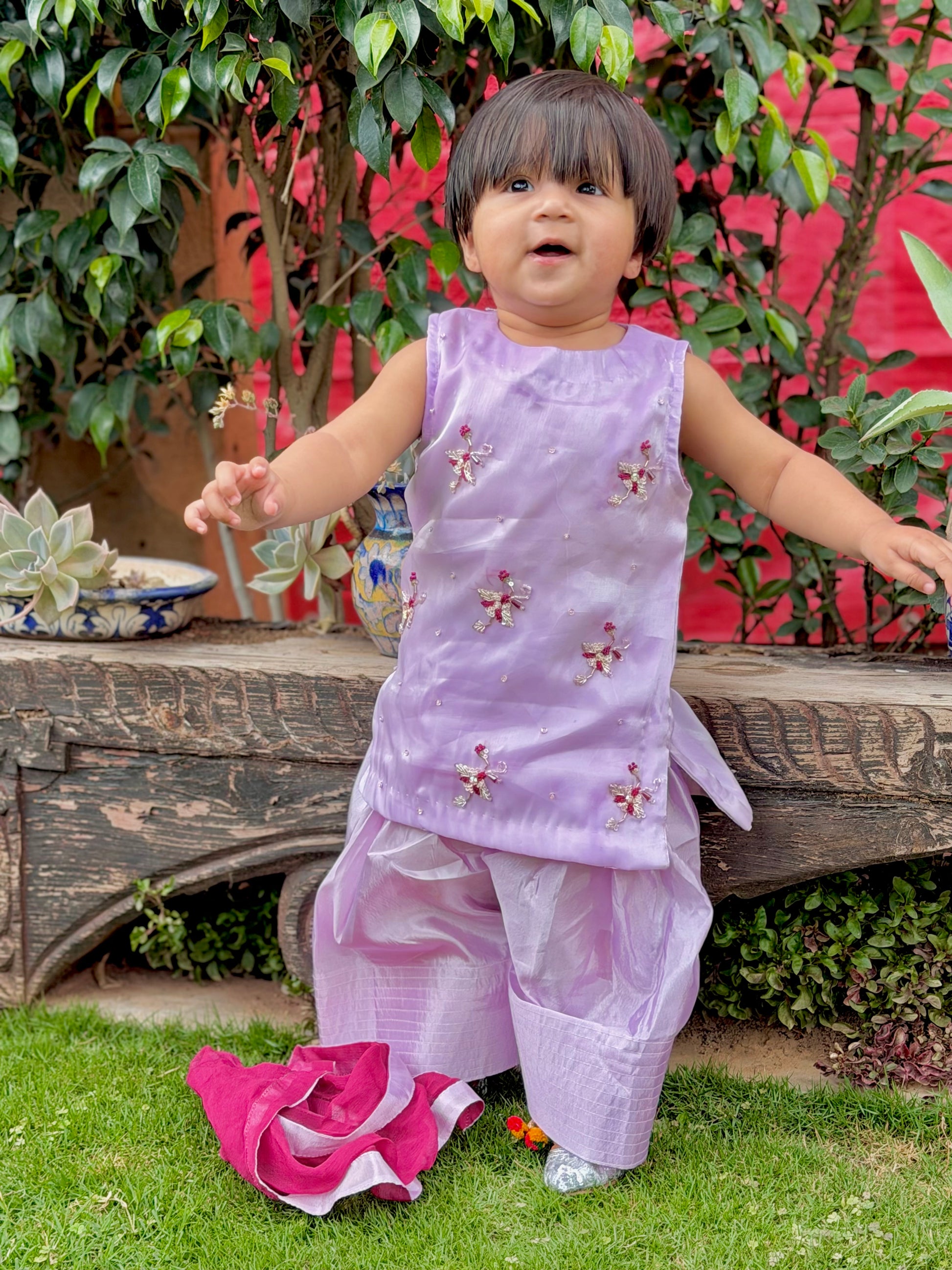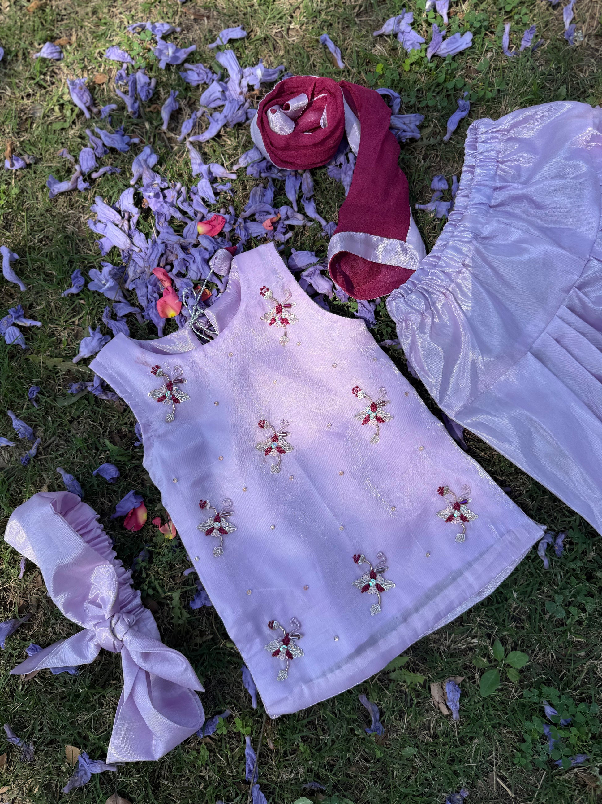 Soft, graceful, and full of charm — this lilac three-piece suit is a beautiful blend of tradition and comfort. The delicately embellished shirt features subtle floral detailing that adds a gentle sparkle, paired with a flowy farshi shalwar that creates a classic, elegant silhouette. Completing the look is a matching dupatta that adds a touch of sophistication and completes the outfit perfectly.