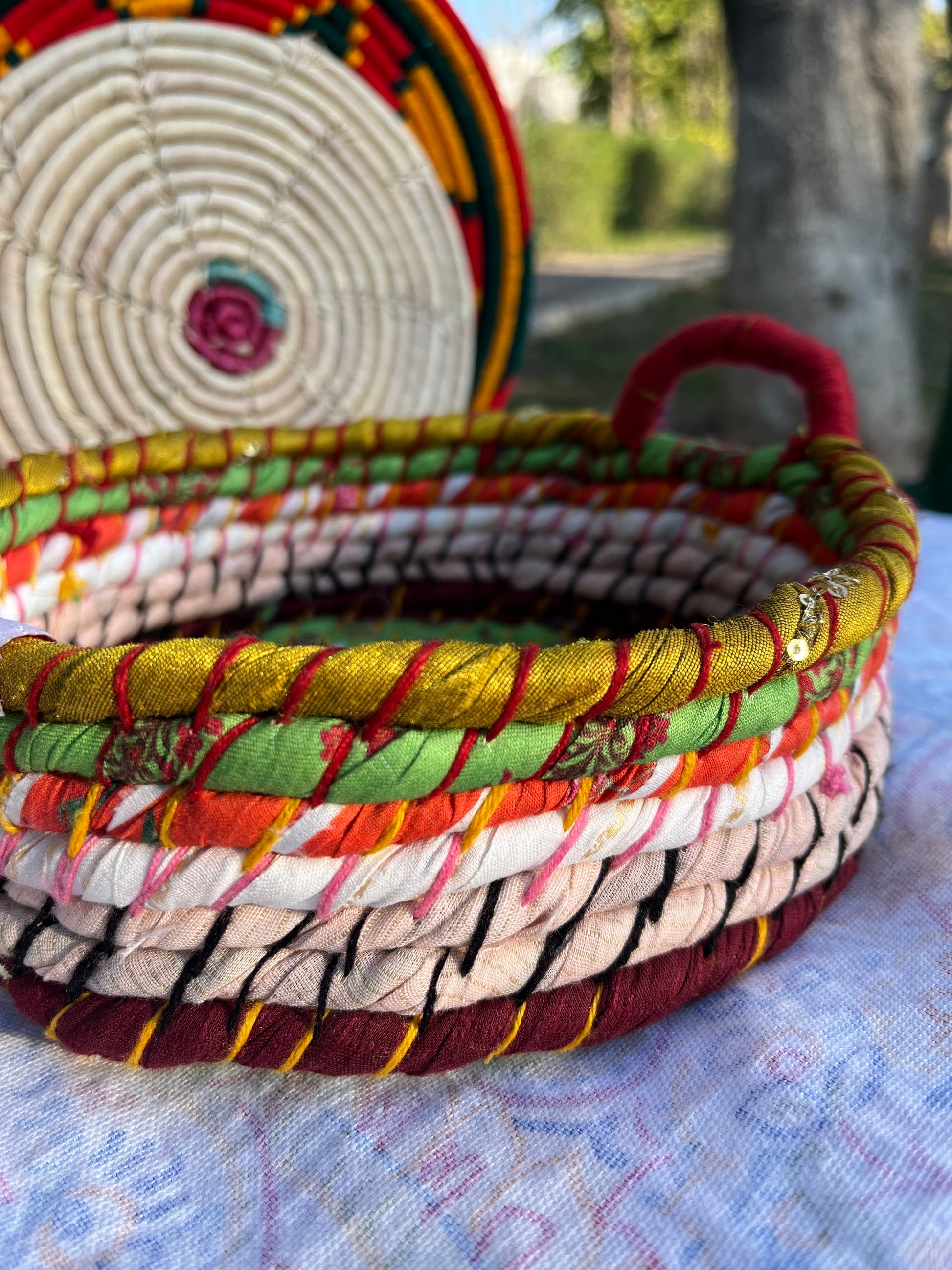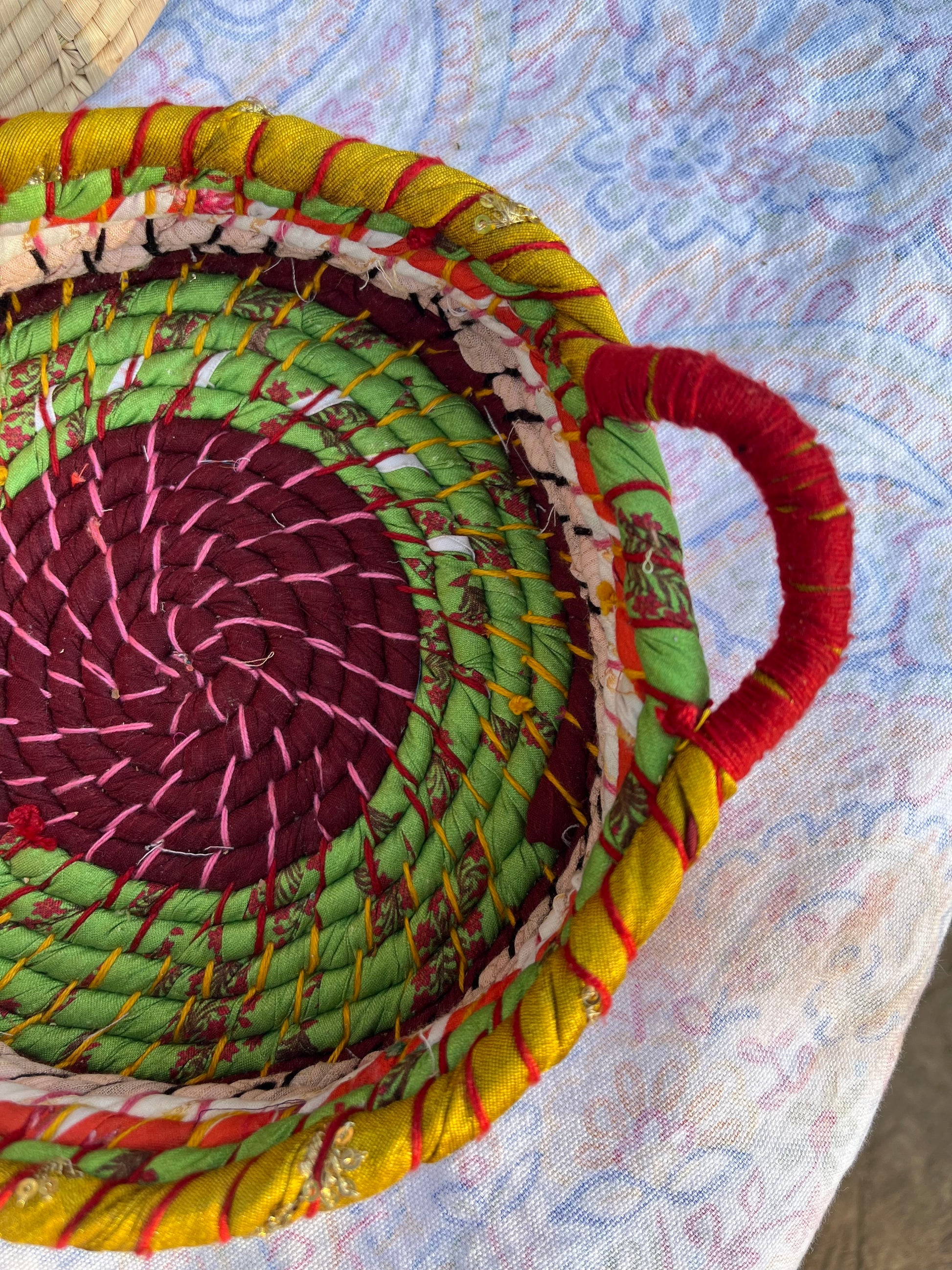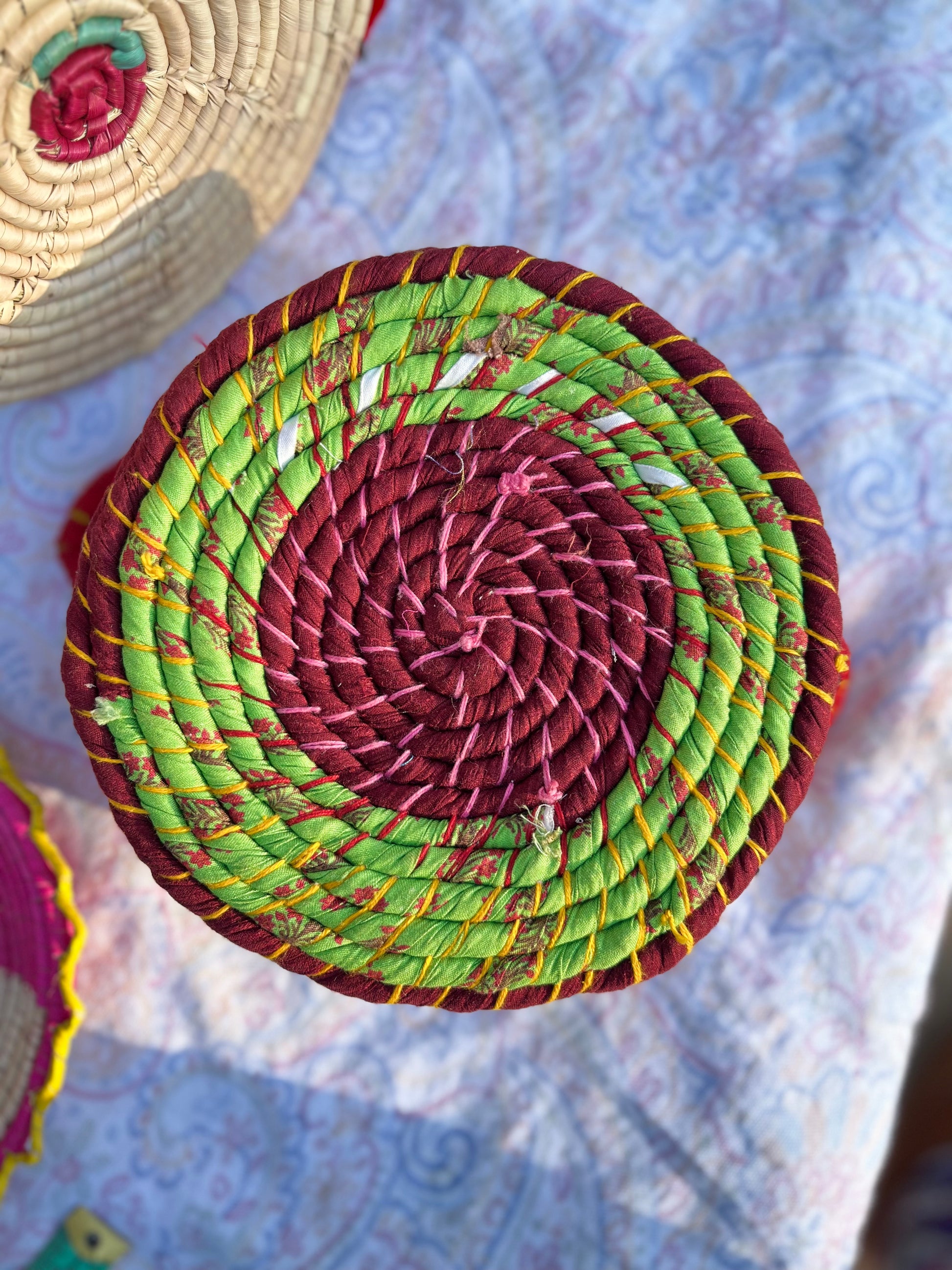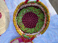 Introducing our lovely plum and green multicolored basket handmade with scraps. Elegantly designed multiple colors of scraps this basket is perfect for any gift!