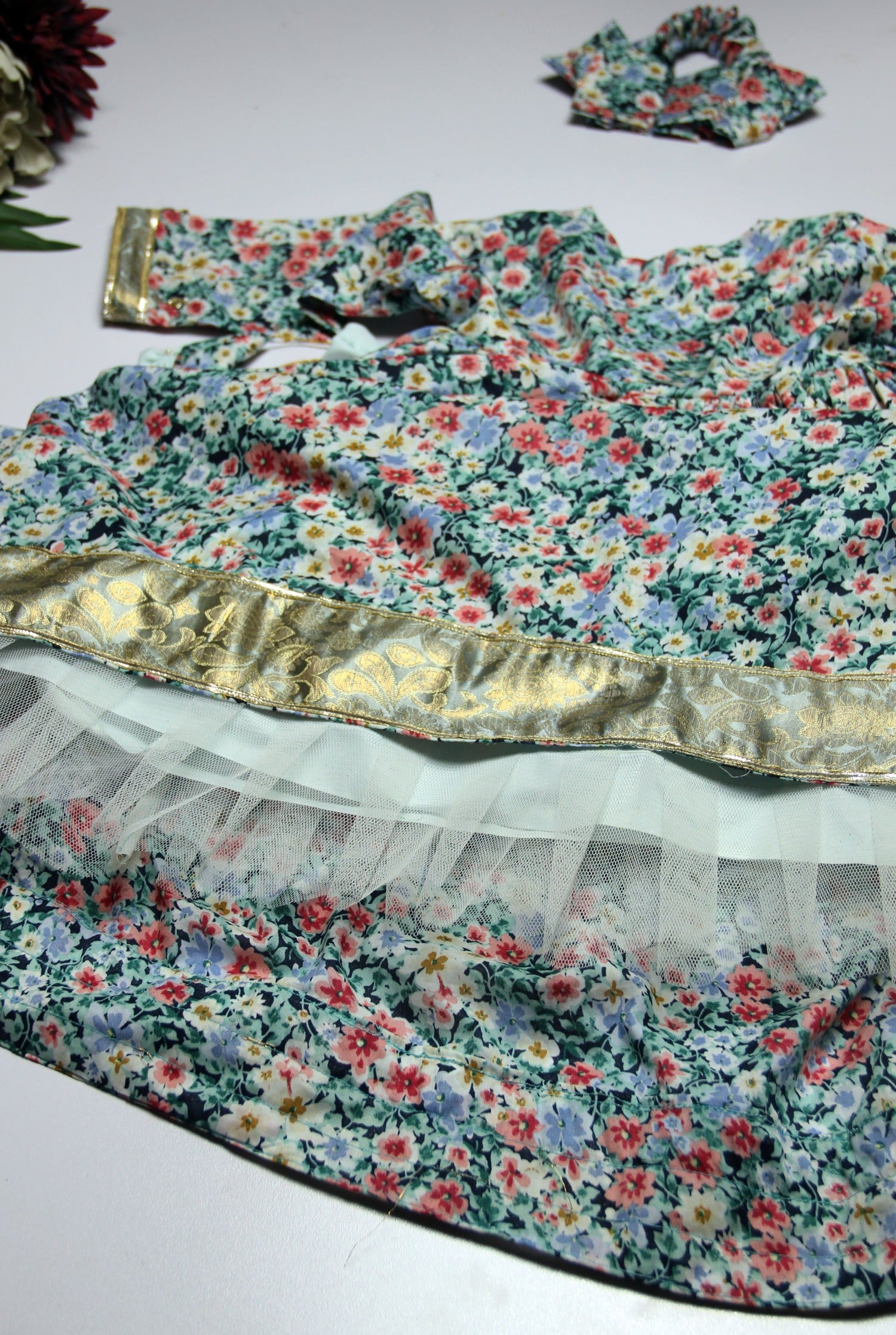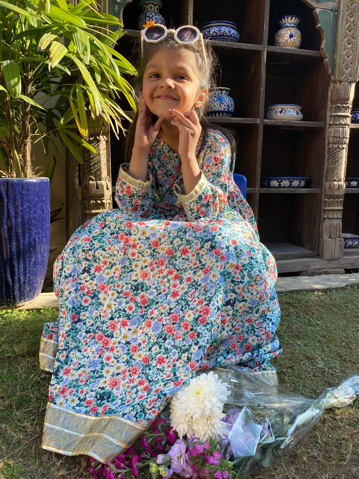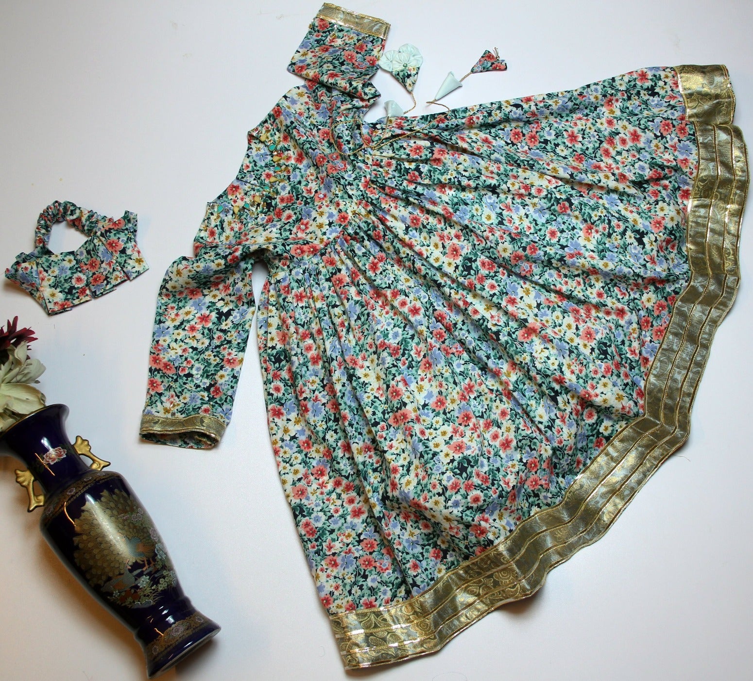 A gracefully elegant design is layered over this chic floral printed long toe maxi rendered in an overall green shade. It features a classy frock style with cancan underneath for flare! The body is adorned with pearls, beads and stones along with matching handmade tussels.