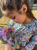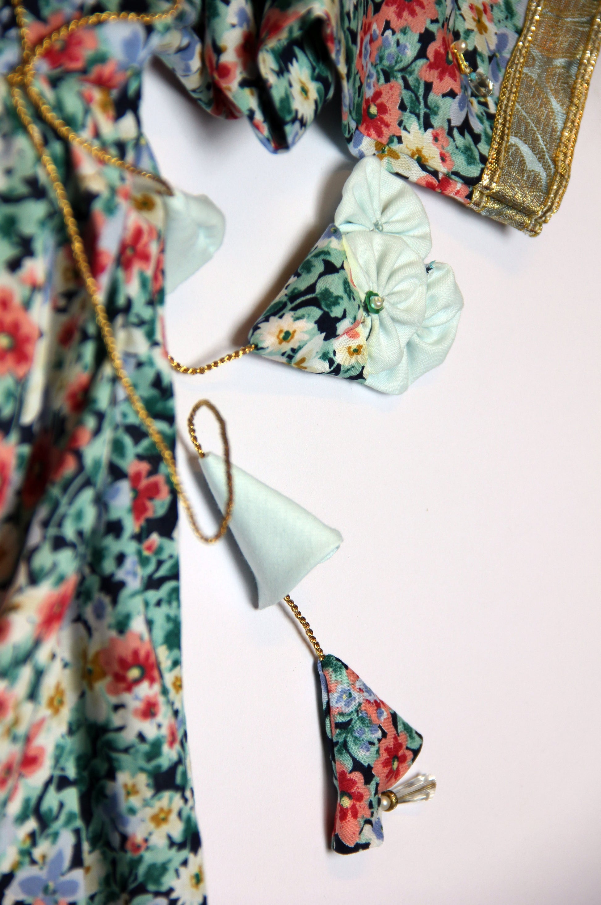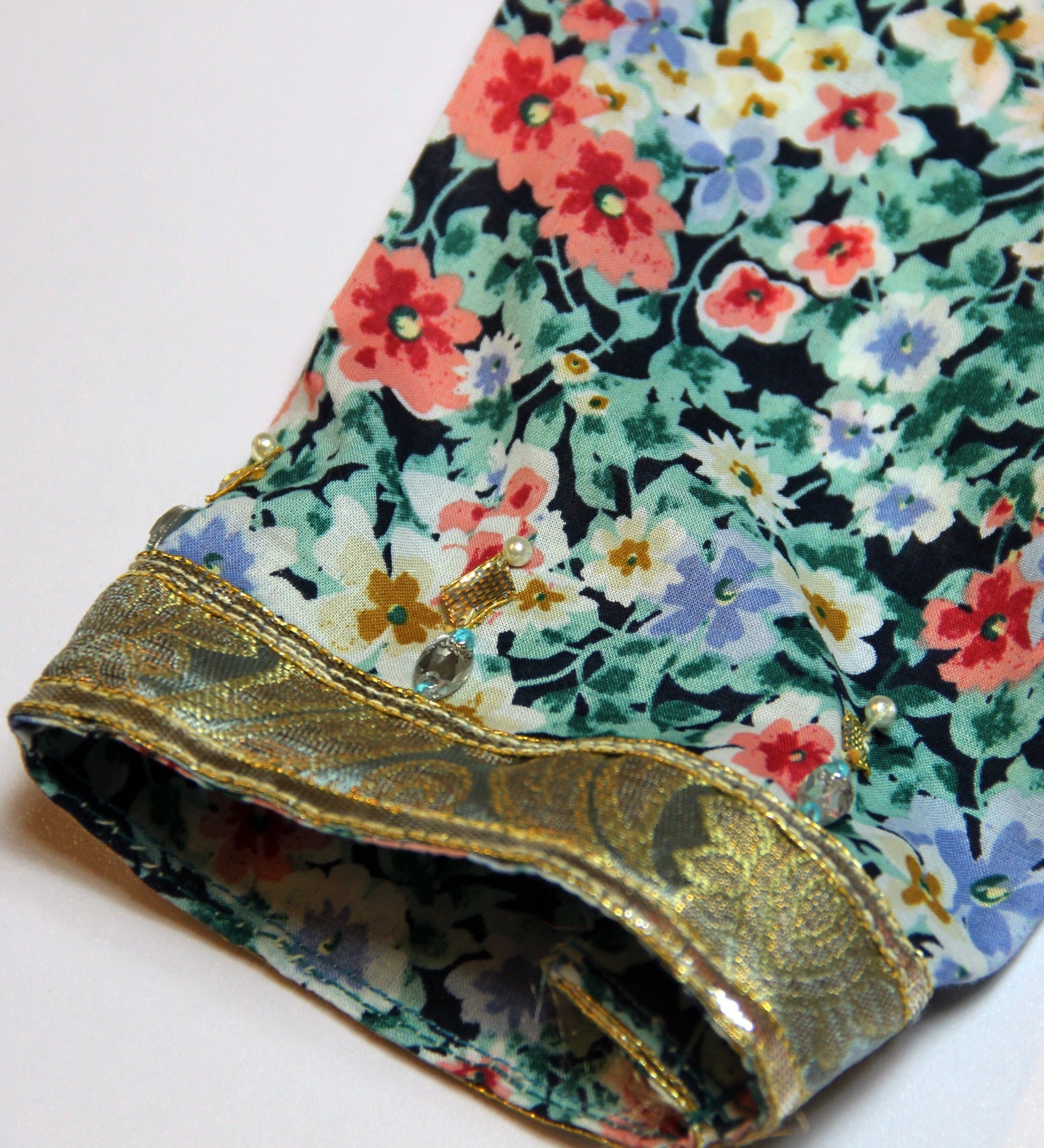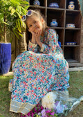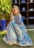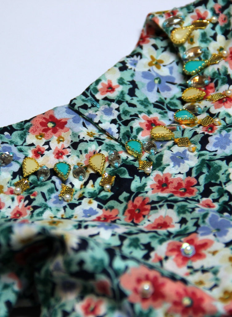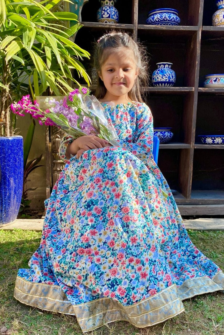 A gracefully elegant design is layered over this chic floral printed long toe maxi rendered in an overall green shade. It features a classy frock style with cancan underneath for flare! The body is adorned with pearls, beads and stones along with matching handmade tussels.