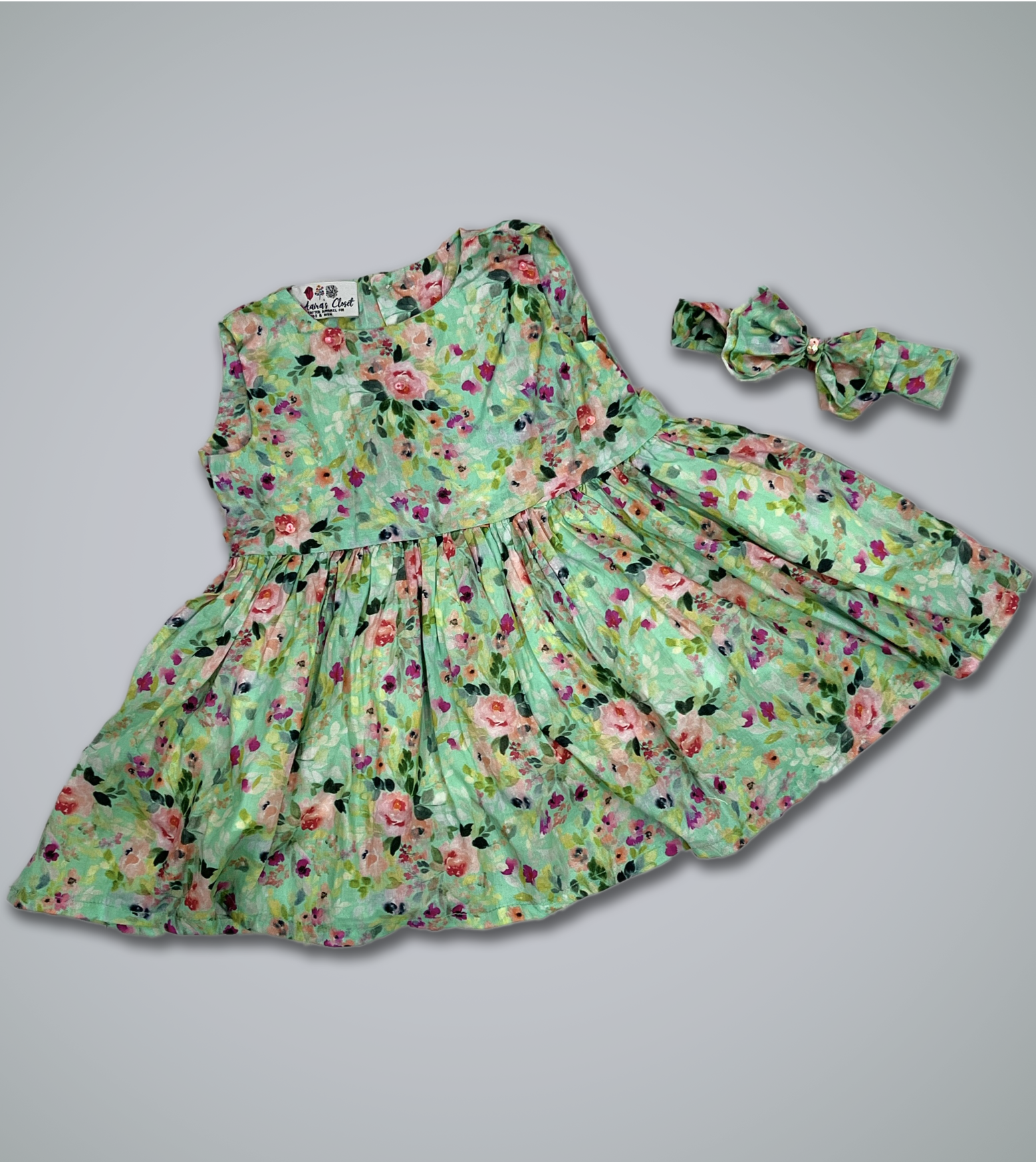 Description: A gracefully elegant composition of a fusion of frock in refreshing pista green shade. It is sibling matching-duo beautifully adorned with captivating floral pattern in vibrant hues. The breathable soft cotton frock comes with matching hair accessory .