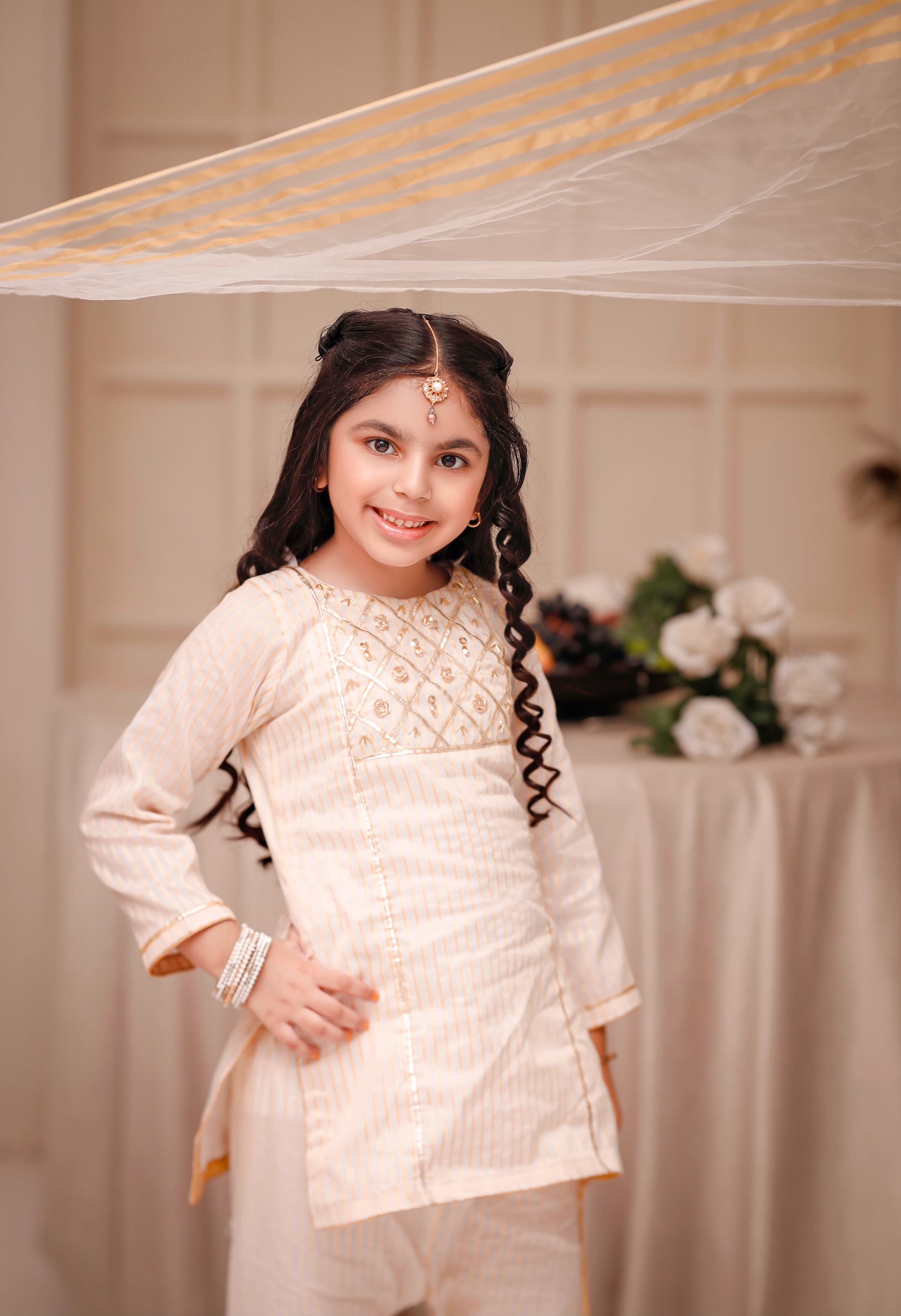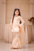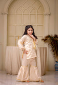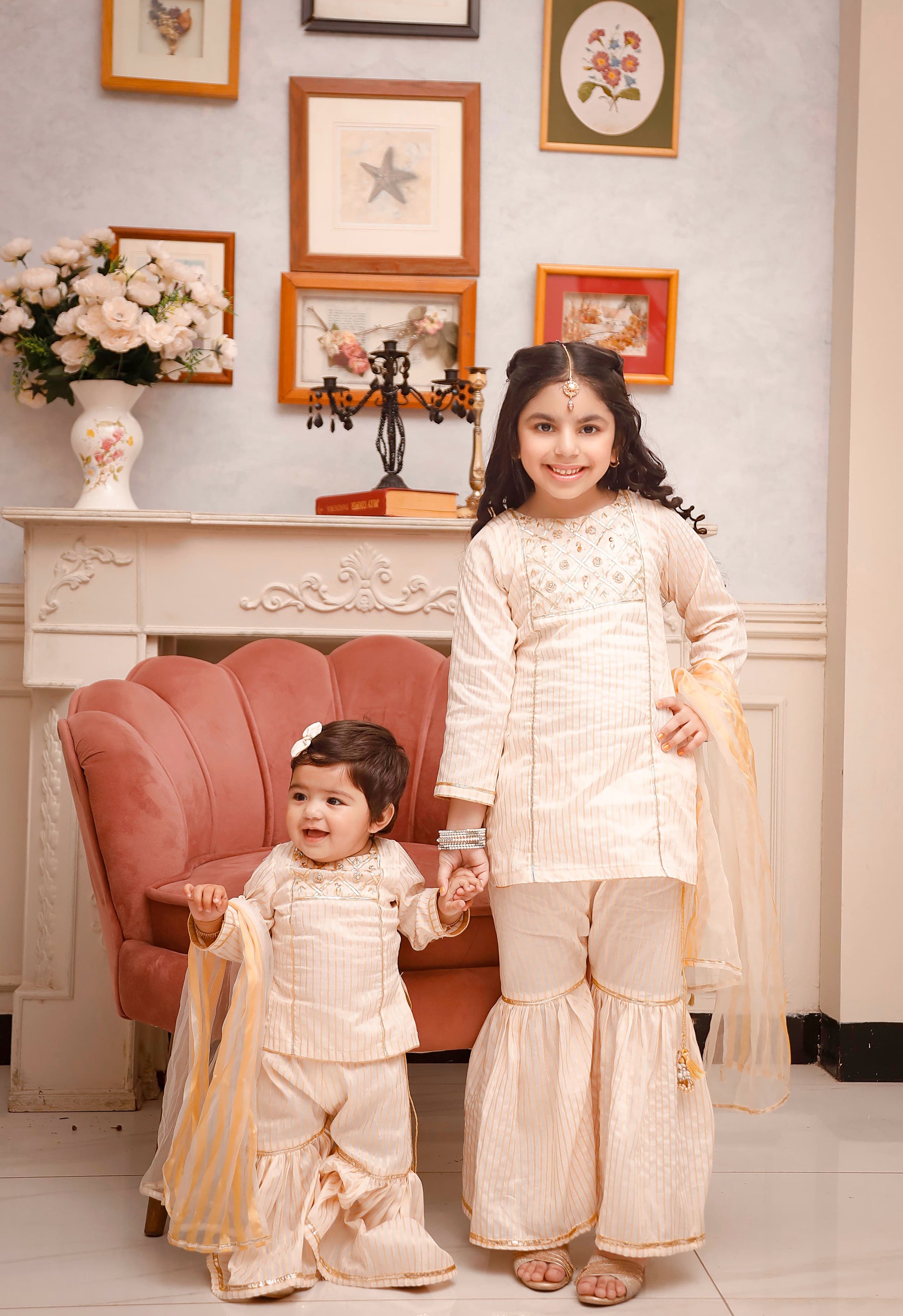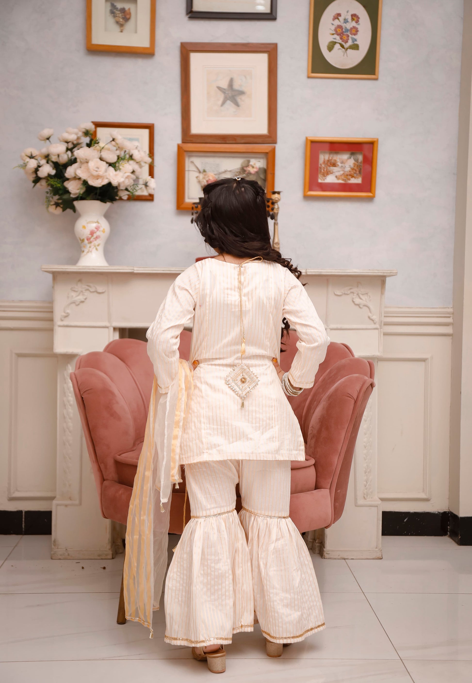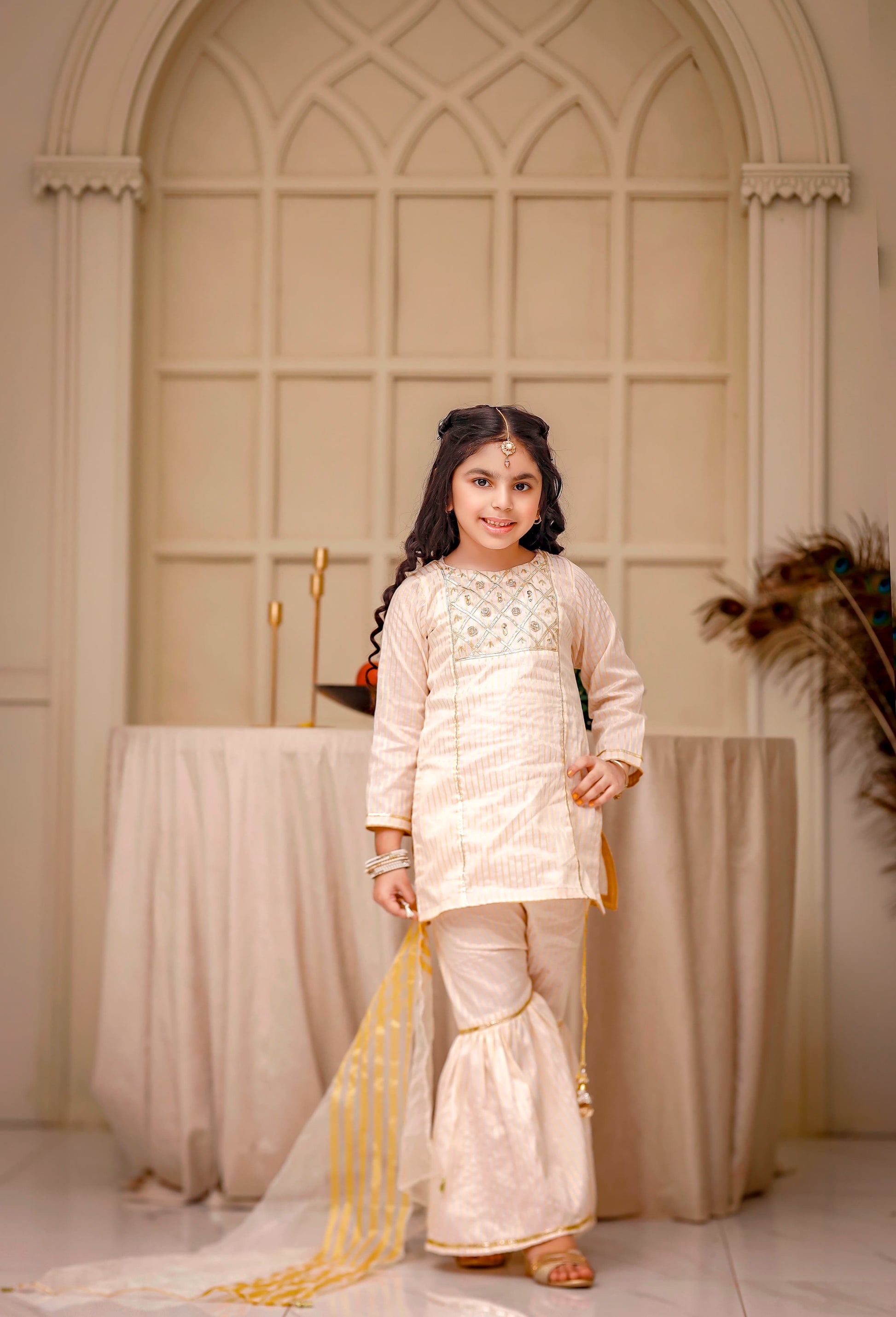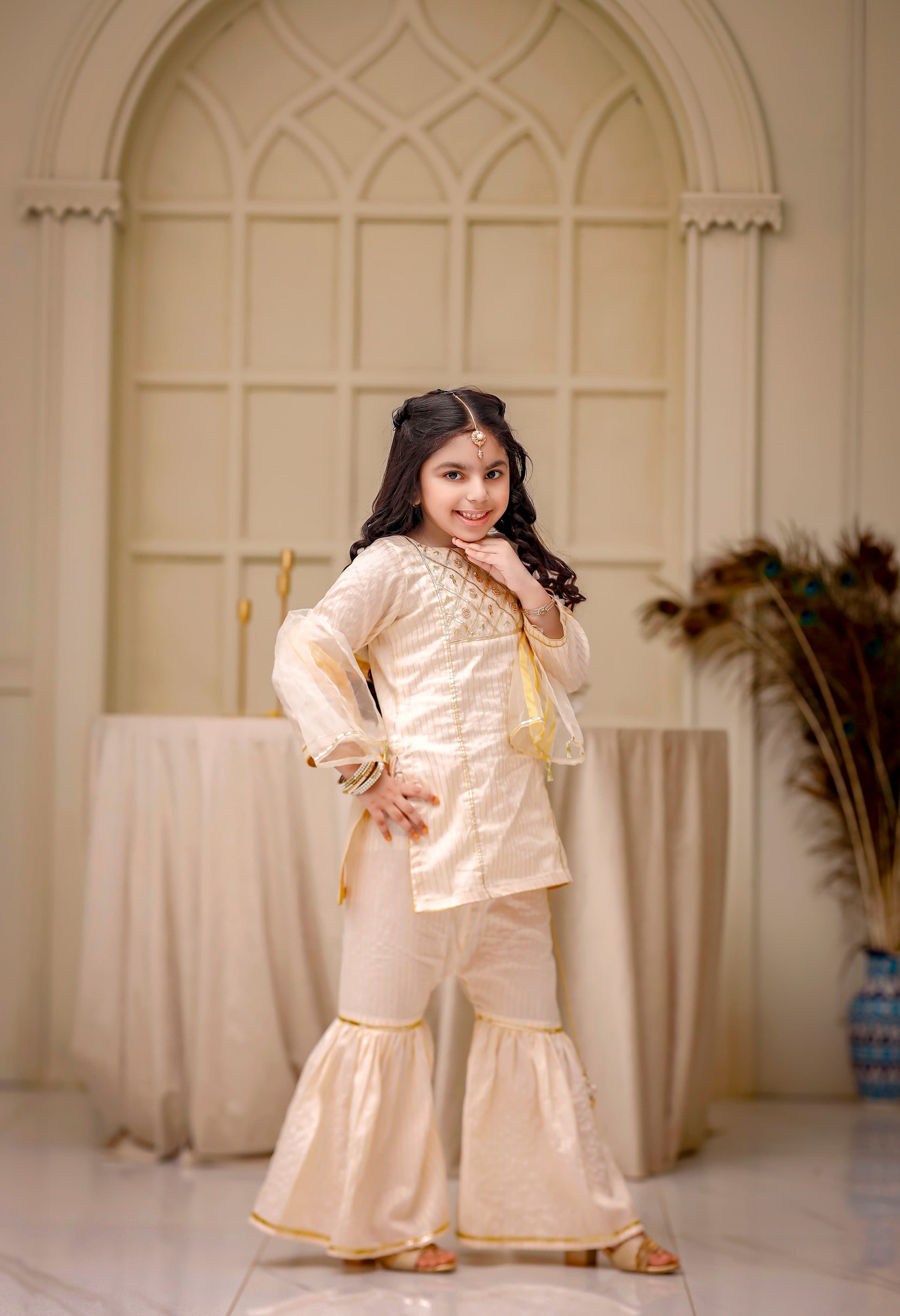 A gracefully elegant classy ensemble rendered in an appealing beige shade. It depicts a classy straight shirt beautifully adorned with captivating floral Co-ord Gharara. Hand crafted Gotta, dapka and stone work front of the shirt. This exquisite outfit is a great option for festive events this season.