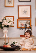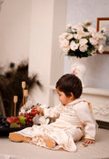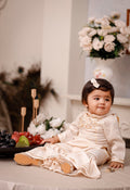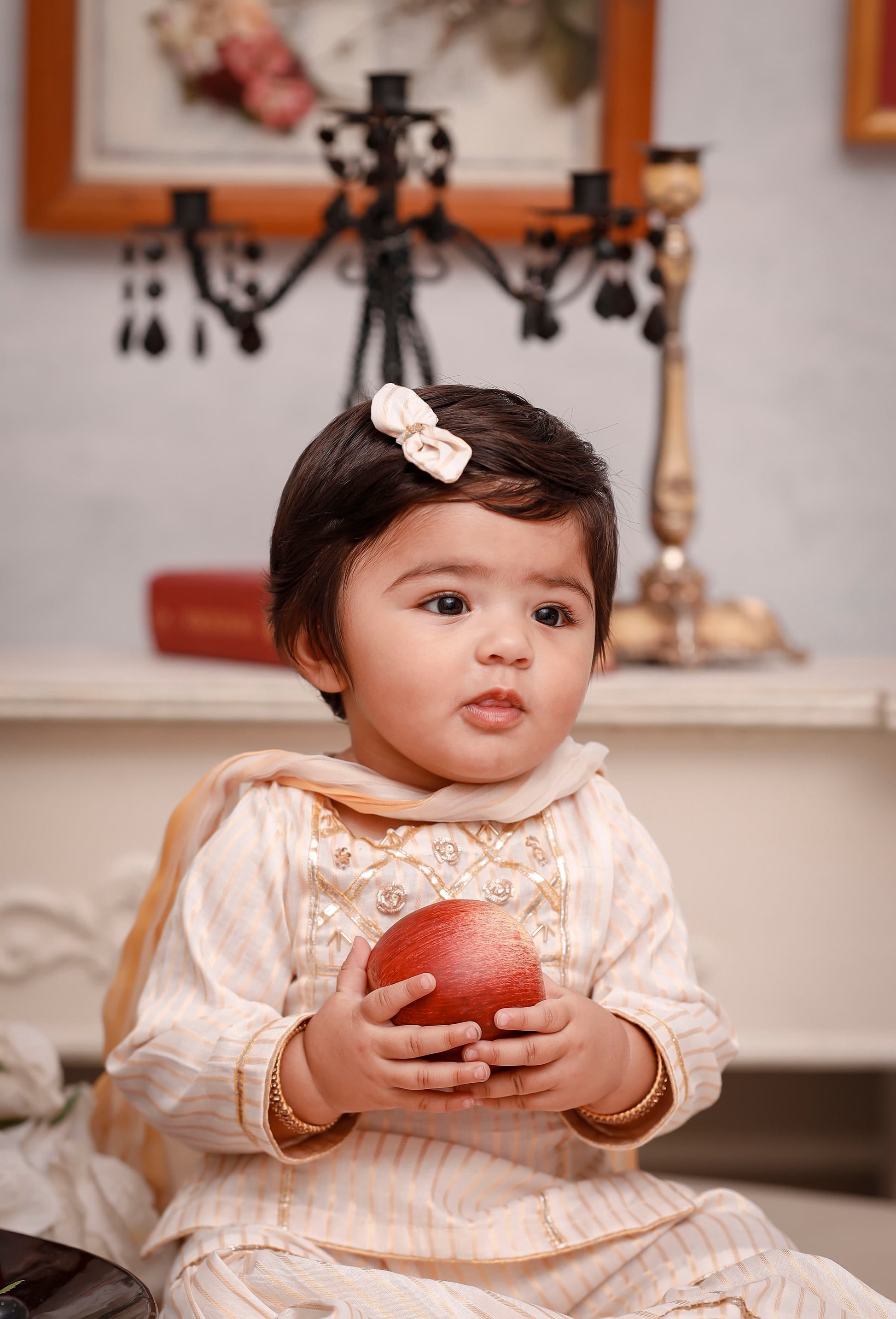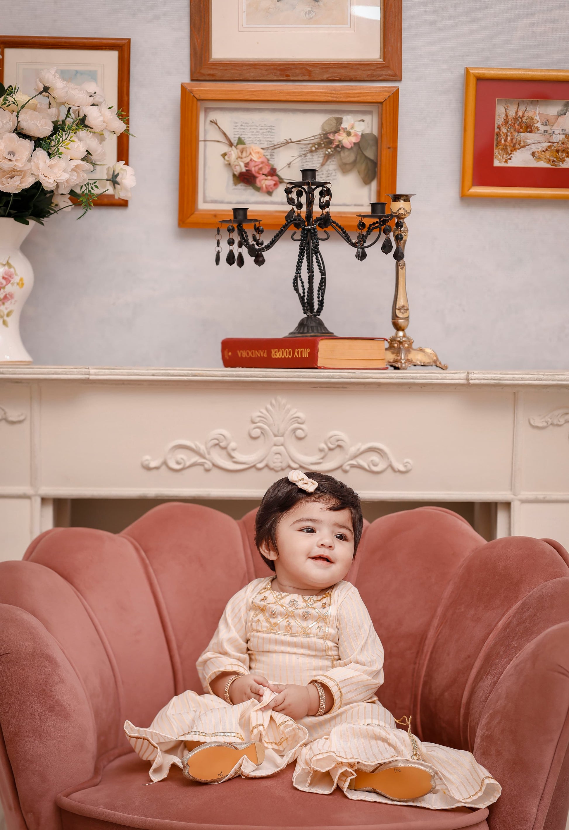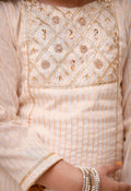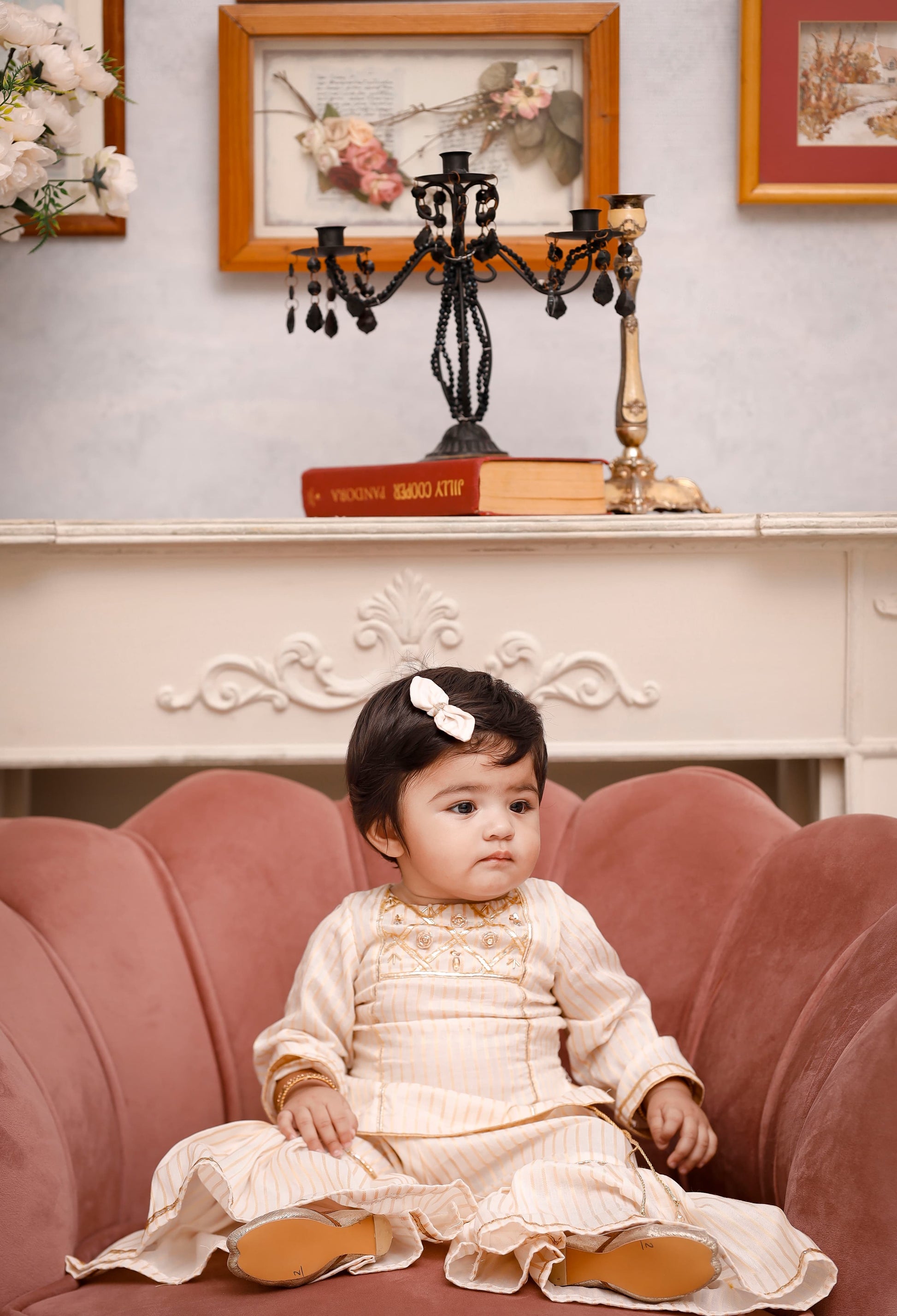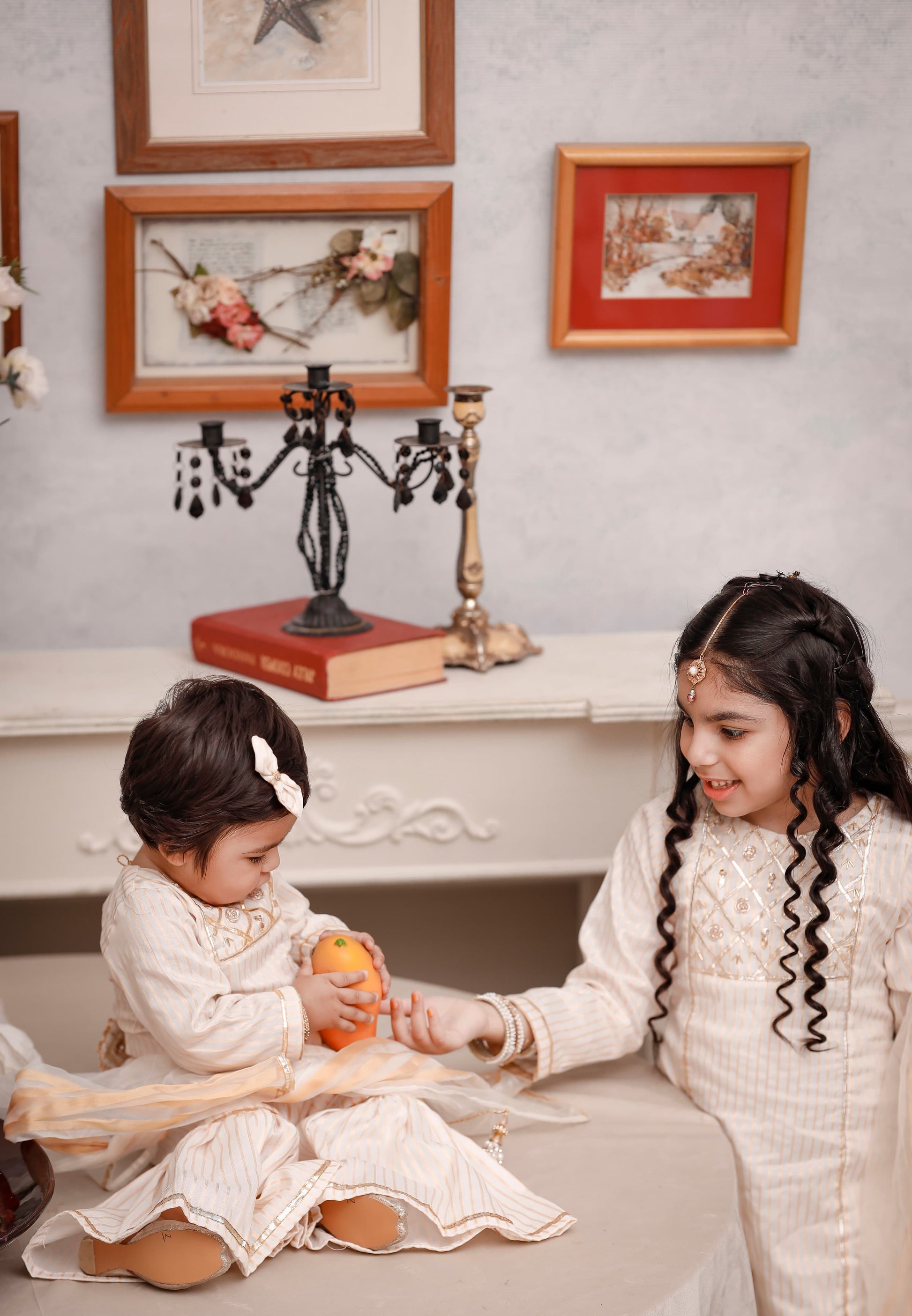 A gracefully elegant classy ensemble rendered in an appealing beige shade. It depicts a classy straight shirt beautifully adorned with captivating floral Co-ord Gharara. Hand crafted Gotta, dapka and stone work front of the shirt. This exquisite outfit is a great option for festive events this season.