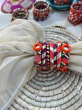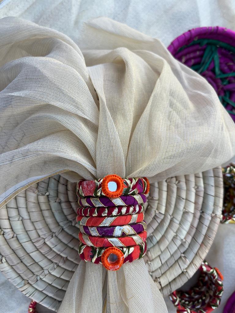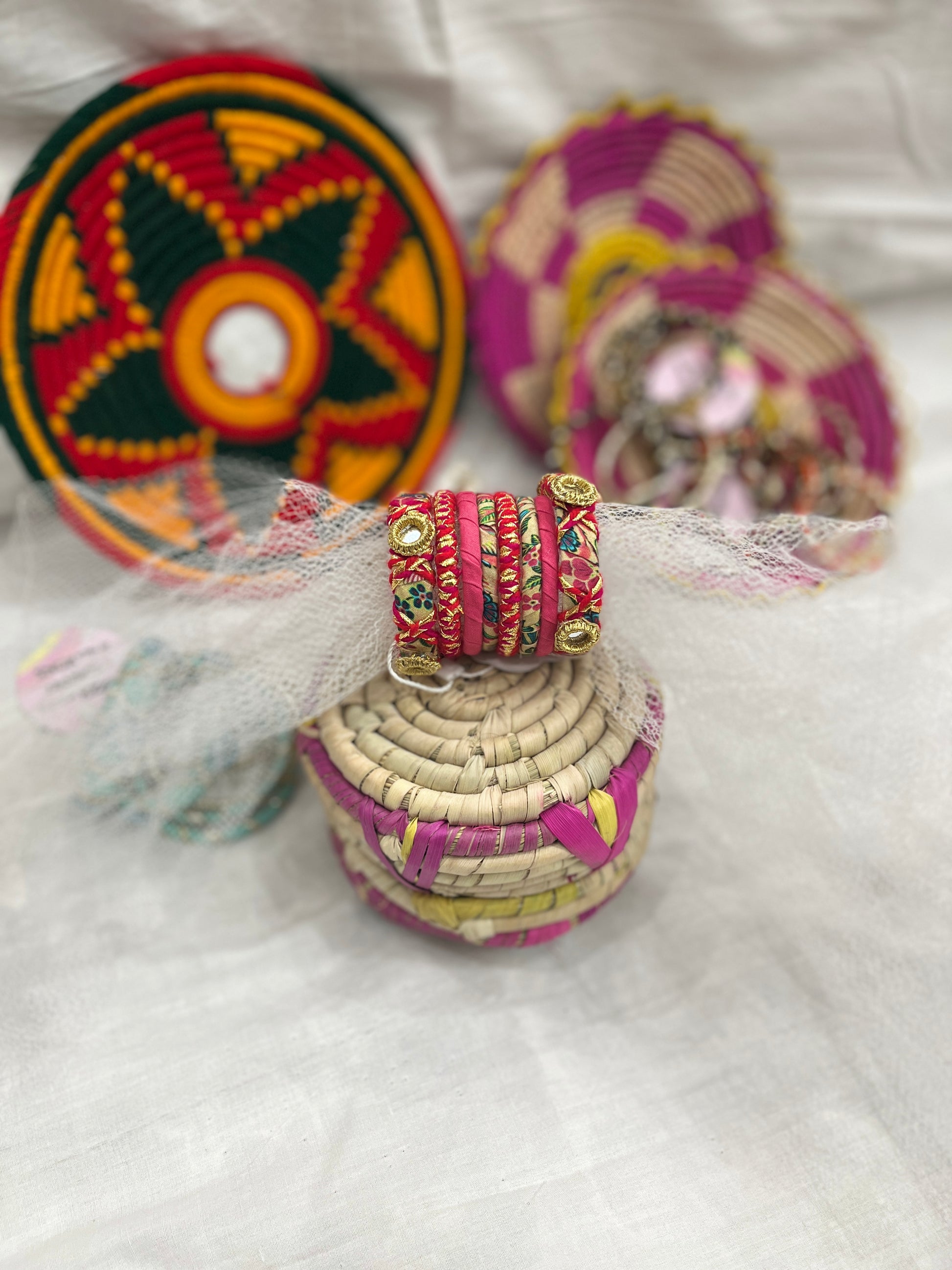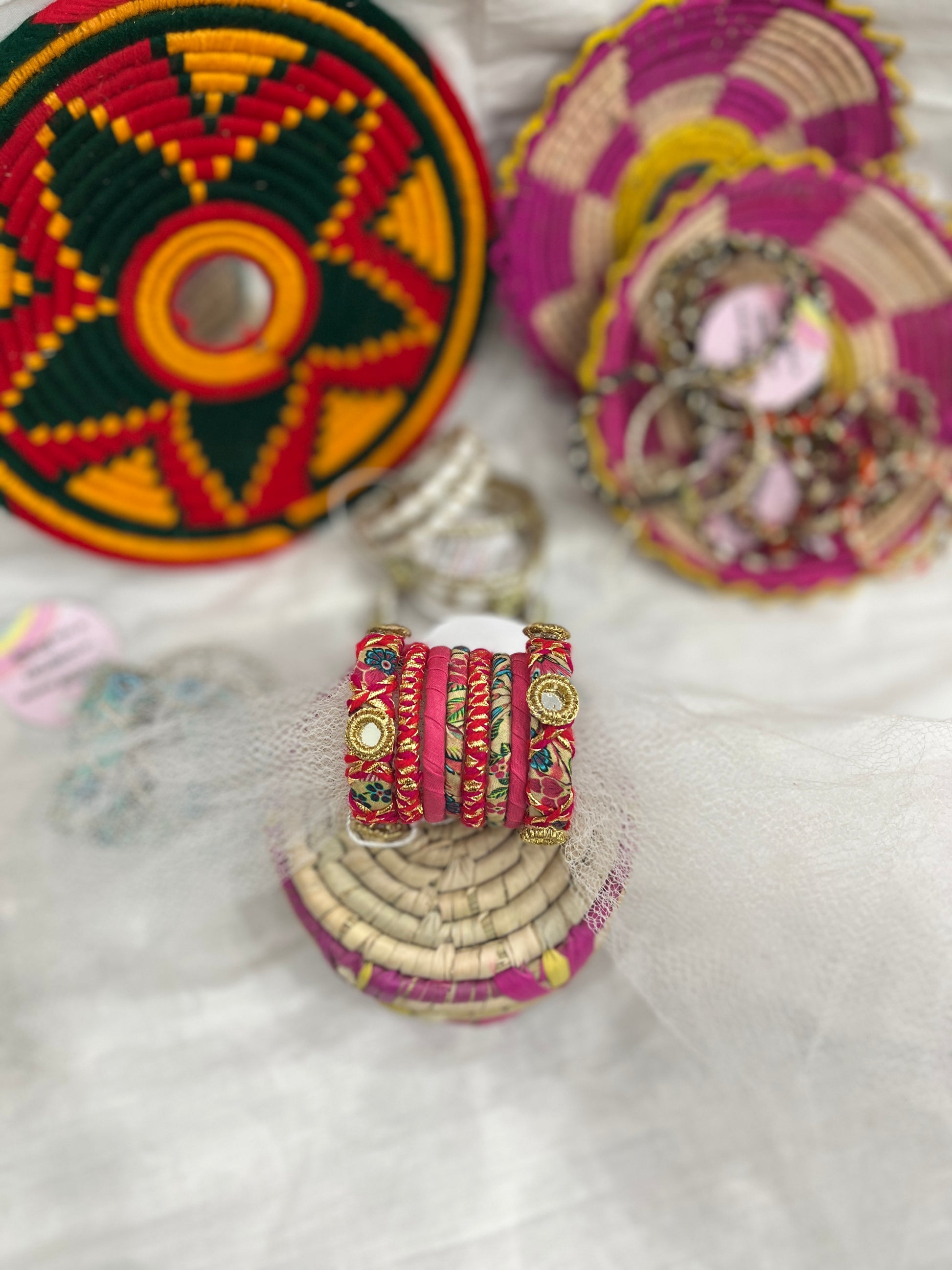 Description: A lovely bangle set that includes 2 karas and 5 bangles. The karas are adorned with beautiful mirrors and the bangles with gorgeous gotta. This set is only available in the most adorable 0-12 months size.